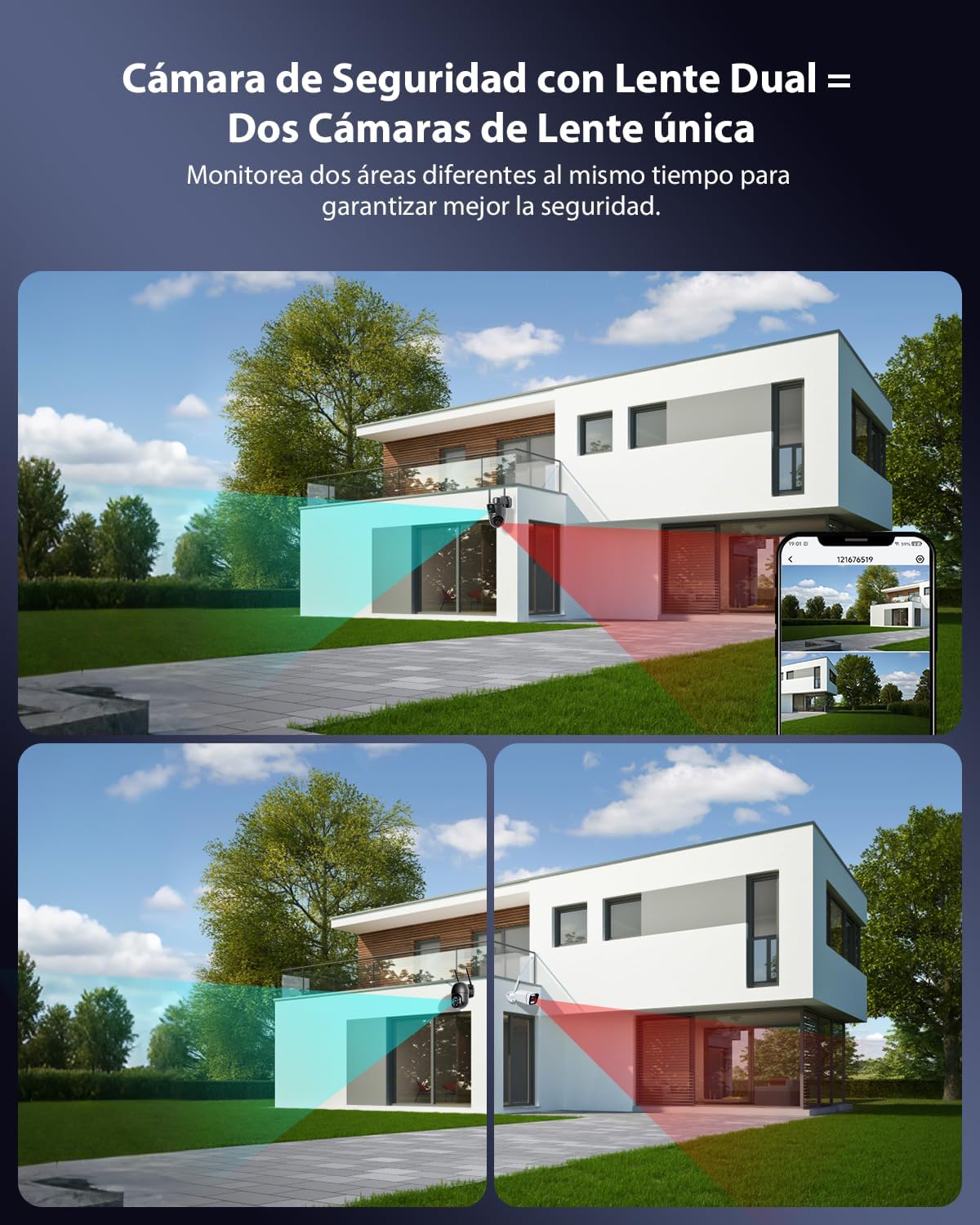 Vigilancia de dos Ángulos en una sola cámara: la cámara de seguridad inalámbrica para exteriores Q3 derece 2 cámaras en 1, lo que equivale a una cámara pt emparejada con una cámara bullet fija. Con lentes duales, sensores pir duales y detectción humana twin, sus lentes superiores e funciones inferiores de forma independientes, lo que permita vigilar dos áreas al Mismo tiempo. Puede ver Ambas Imágenes en Direto SimultánaMeMe A Través de la App CloudEdge/Cococam, Mientras que la lente inferior puede ajustarse a distancia mediante los controles pt pt (355 ° panorámica 90 ° inclinación) para cámbiar el área de vigrea.
