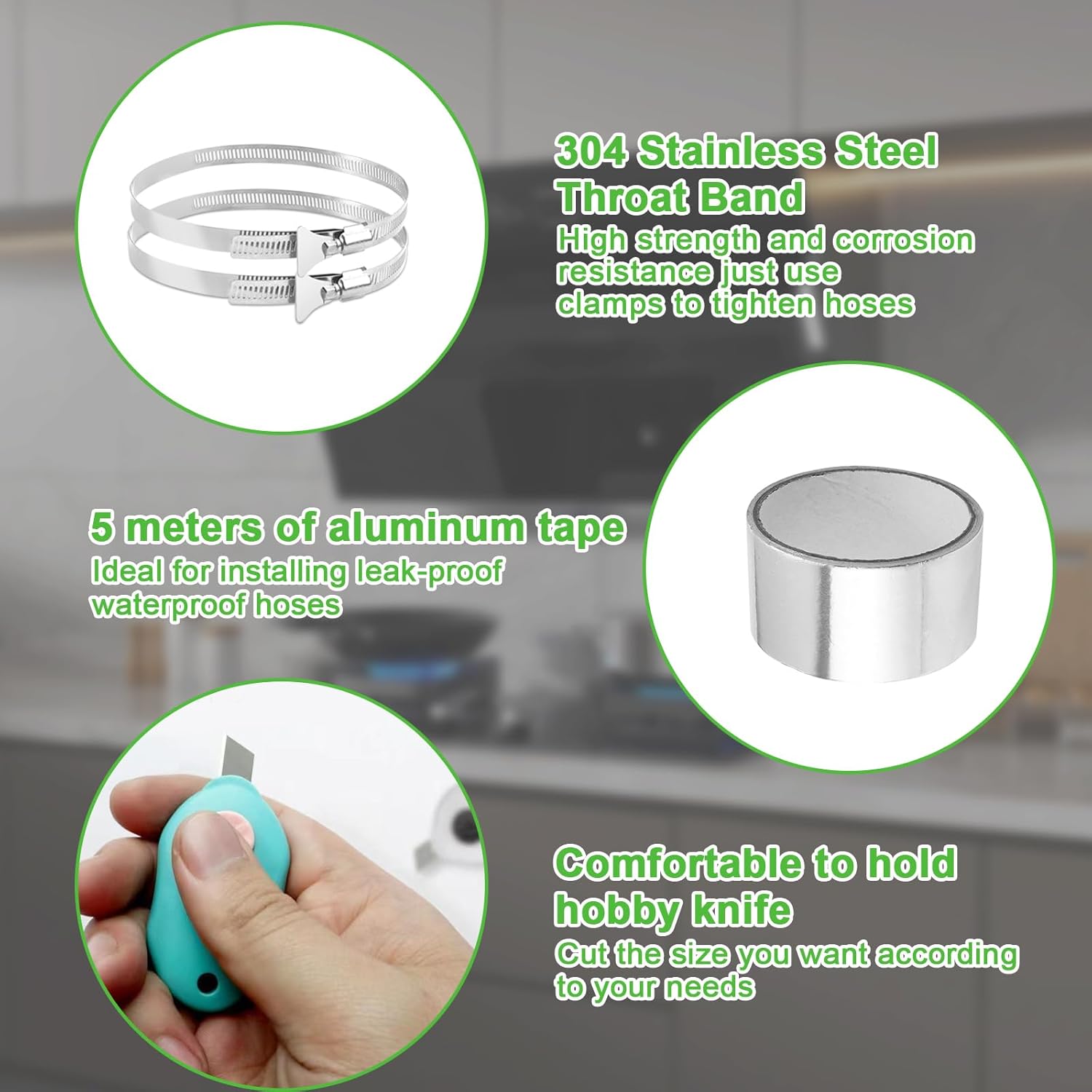 El paquete incluye: 1 manguera de tubo de diámetro inside de 80 mm, 2 abrazaderas de acero inoxidable, 1 rollo de cinta de papel de aluminio y 1 cuchillo; el rango aplicable de la abrazadera es de 72 mm/2,8 pulgadas a 95 mm/3,7 pulgadas, adecuado para ventiladores tubulares de 80 mm, ventiladores de extracción, abrazaderas de manguera, bridas, rejillas de ventilación, and many others.