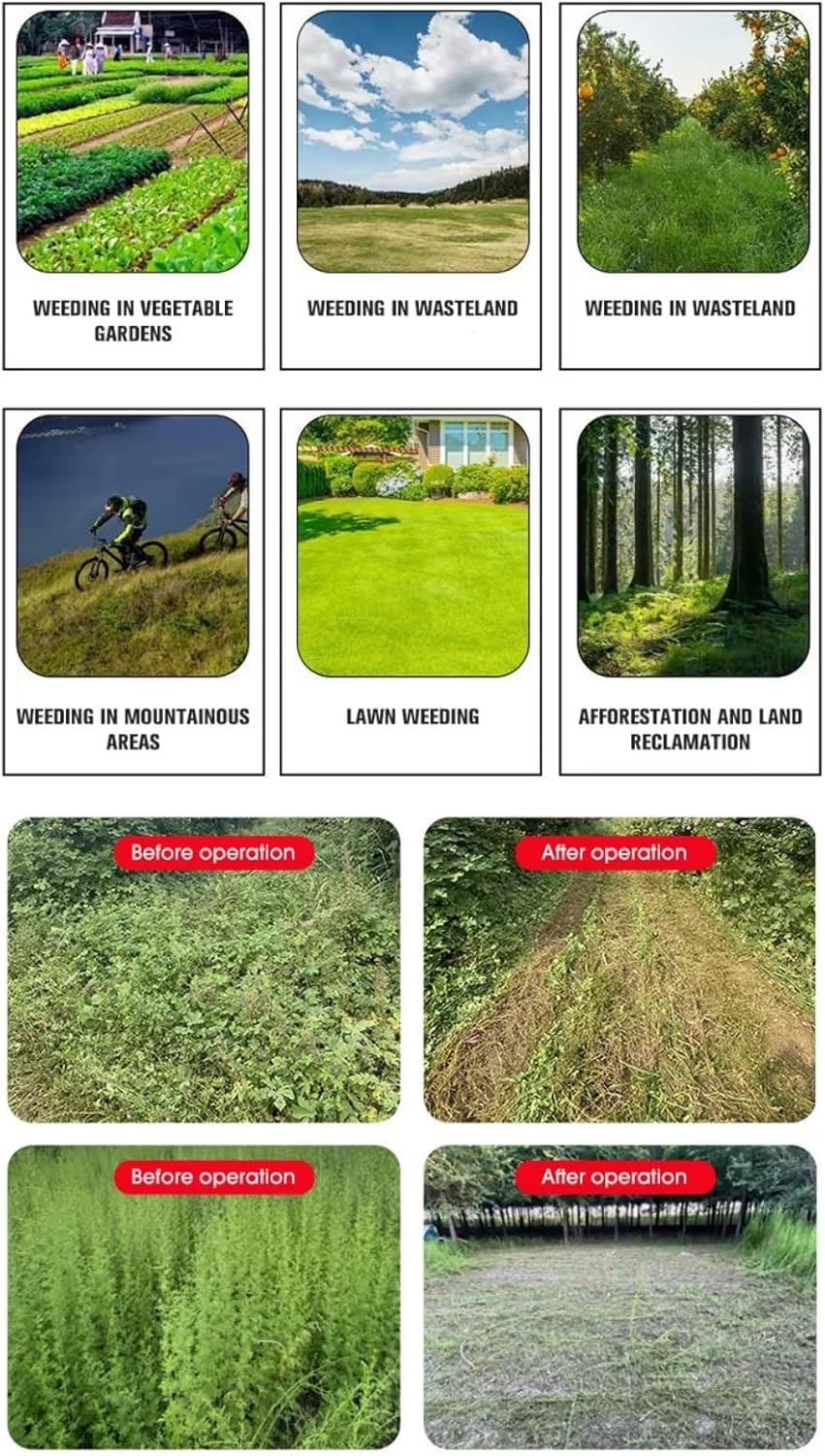 Aplicacia Versátil: Maneja Diversas Tareas, Desde Cortar Césped de Jardín Hasta Eliminación de Maleza Agrícolas E incluso Limpieza posterior a La Cosecha.