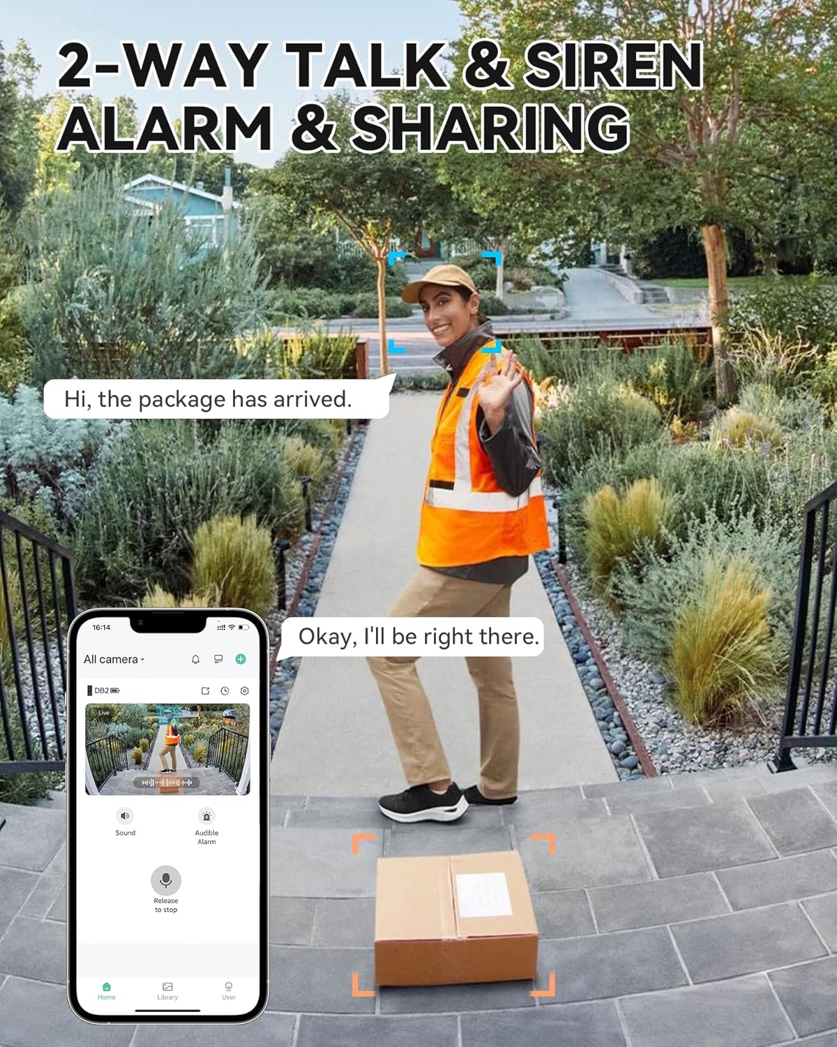 Videollamadas directas y uso compartido multiusuario: con la cámara de timbre HD, puedes realizar llamadas de audio bidireccionales CPVAN desde cualquier lugar, en cualquier momento. Cuando un visitante toque el timbre, recibirás una videollamada directa en tu smartphone a través de la aplicación Vicohome, lo que te permite comunicarte con ellos en tiempo actual. Comparte el acceso a la cámara de seguridad con los miembros de tu familia, permitiéndoles ver la transmisión en vivo simultáneamente.