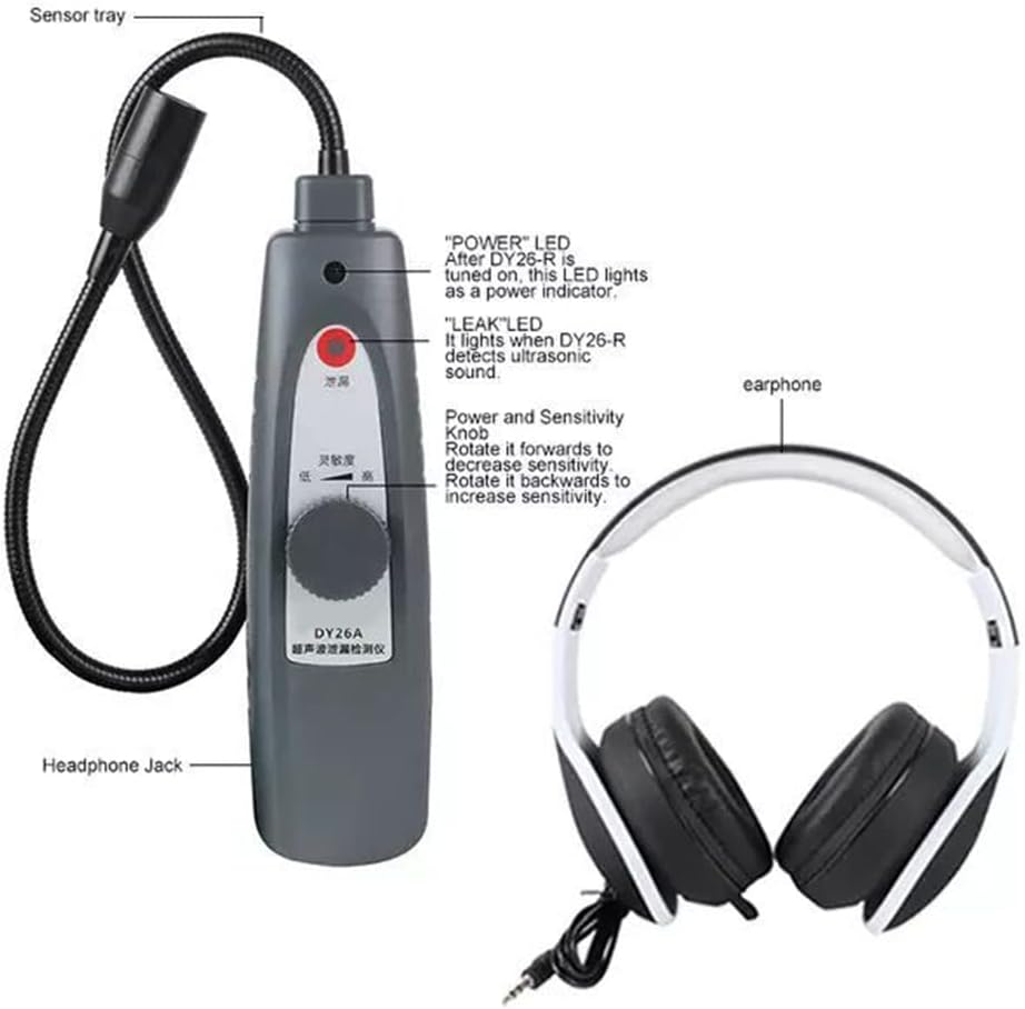 Viene con un transmisor que emite una frecuencia de ultrasonido para ayudar a localizar fugas que no están presurizadas. Suficiente para emitir frecuencias que el detector puede recoger. (Solo DY26)