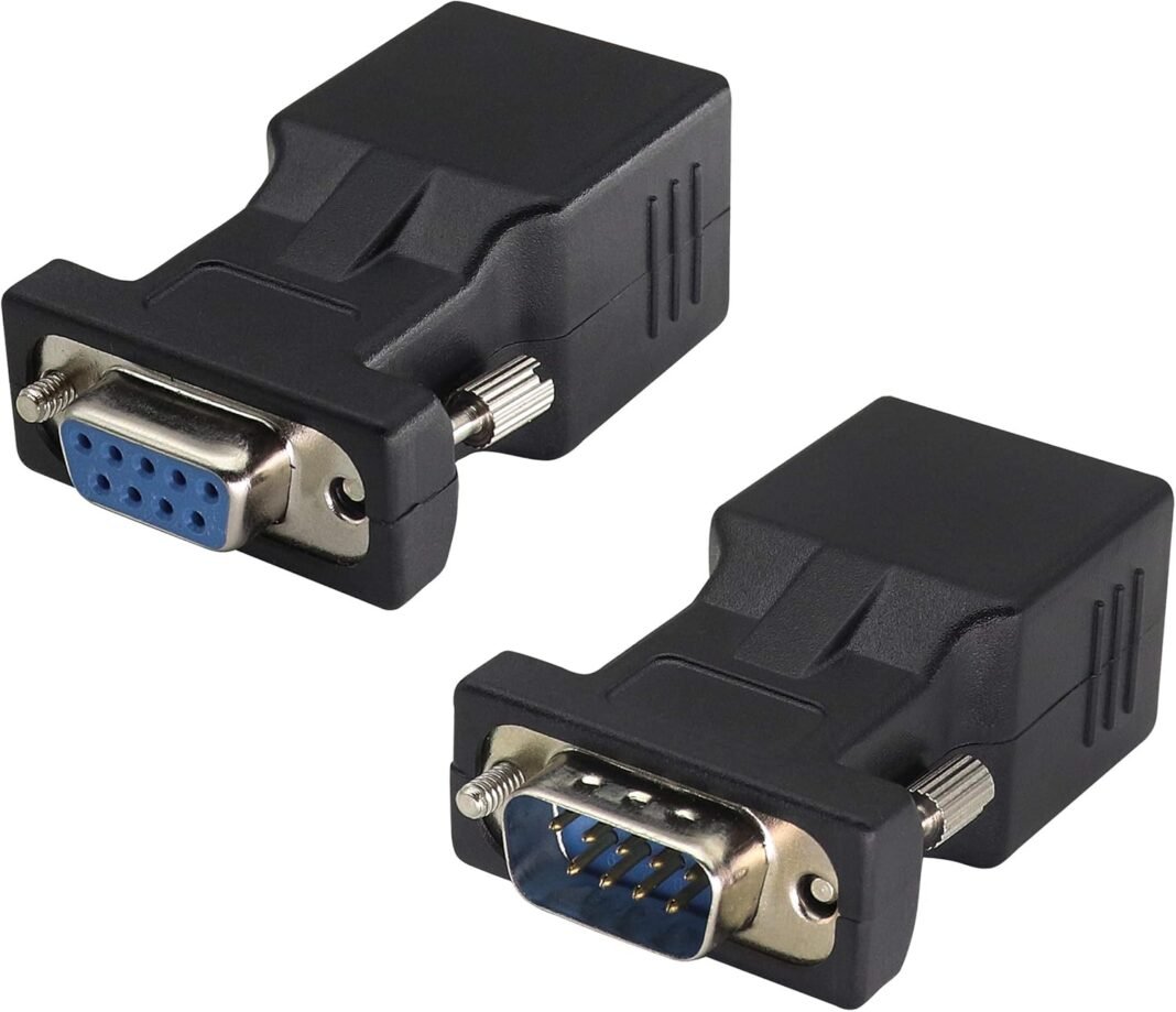 Cantidad: (2Unidades)Tamaño:Largo,Ancho, Alto(5.6cm * 3.4cm * 2.2cm)Materials:Plástico.Colour:Negro Conector 1: Adaptador RJ45 Hembra de 8 Pines a DB9 Macho de 9 pines,Conectores 2:Adaptador RJ45 Hembra de 8 Pines a DB9 Hembra de 9 Pines.Extensor B9 a RJ45:Las Señales DB9 (RS232) se Transmiten a través del cable de purple Cat5 Cat6 Cat7 .El cable de purple se Conectó a la Interfaz de purple con dos Adaptadores RJ45 Hembra.Equipo Aplicable al Producto: Suitable con Todos los Dispositivos de Interfaz VGA Estándar, tales como:TV LCD, Computadora PC,Computadoras Portátiles,Proyectores,DVD,Cajas Superiores Máquina digital,PDA,Impresora de Códigos de barras,Monitor y más Dispositivos con conector DB9,and so on. Al usar este Adaptador,se Recomienda Usarlo Dentro de una Distancia de 1-20 Metros(si la Distancia de Transmisión Pueden Aparecer 20 Metros El Video de Transmisión no es claro, Fantasma, and so on.).Nota 1:La Función de este Adaptador es solo Para Transmitir datos, no se Puede Utilizar como una Configuración de Conmutador Nota 2:Por lo Normal,este Producto Debe Usarse en pares.Este producto es solo un Adaptador para Extensión, no un Adaptador de Consola «