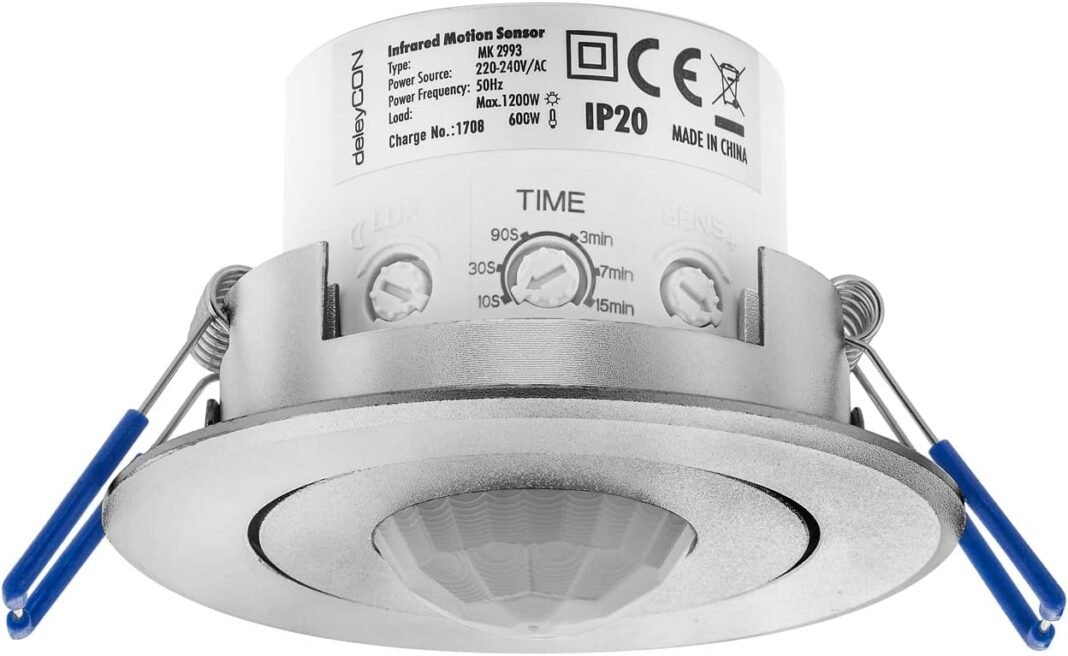Deleycon 1x Infrarrojos Detector de MoviMiento de Techo en el Inside – Alcance 8m A 360 ° Brillo Ambiente Ajustable IP20 Montaje Empotado Aluminio