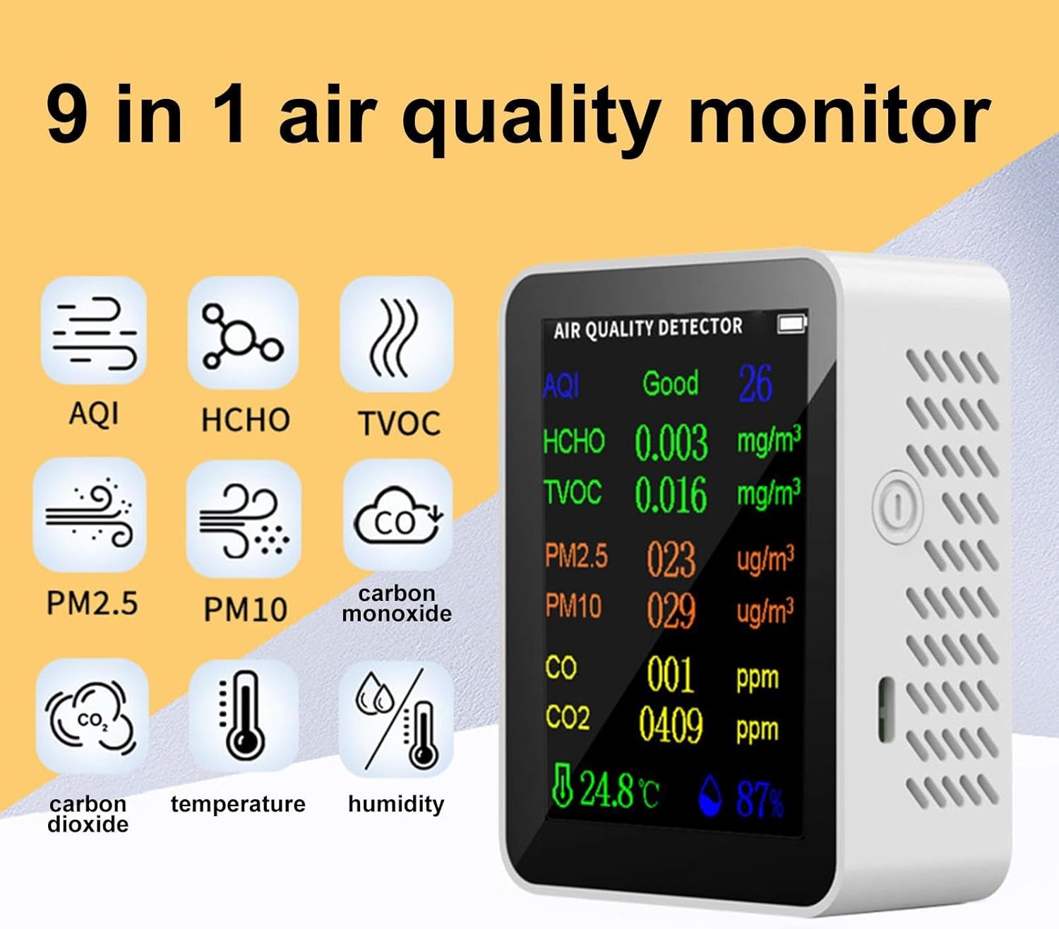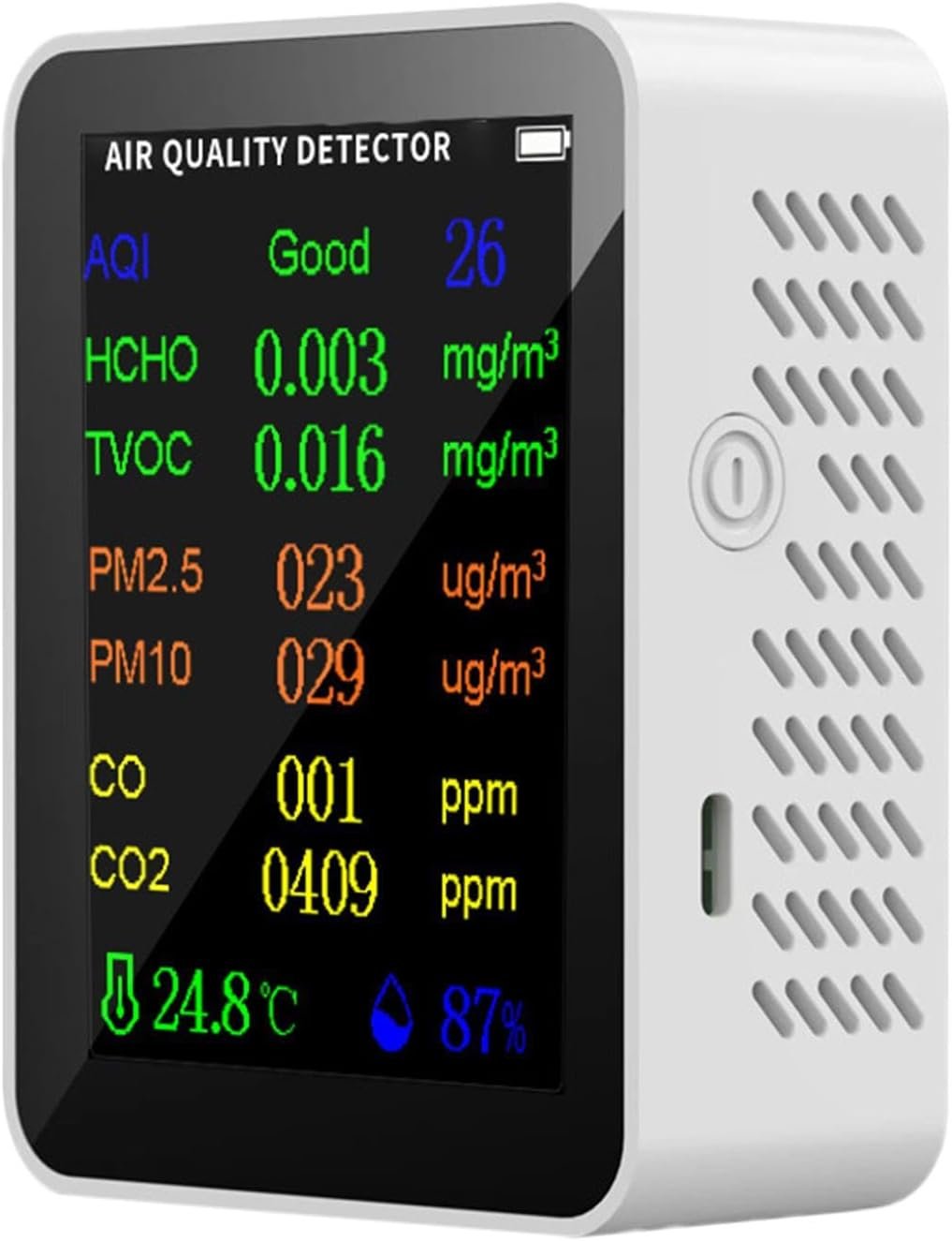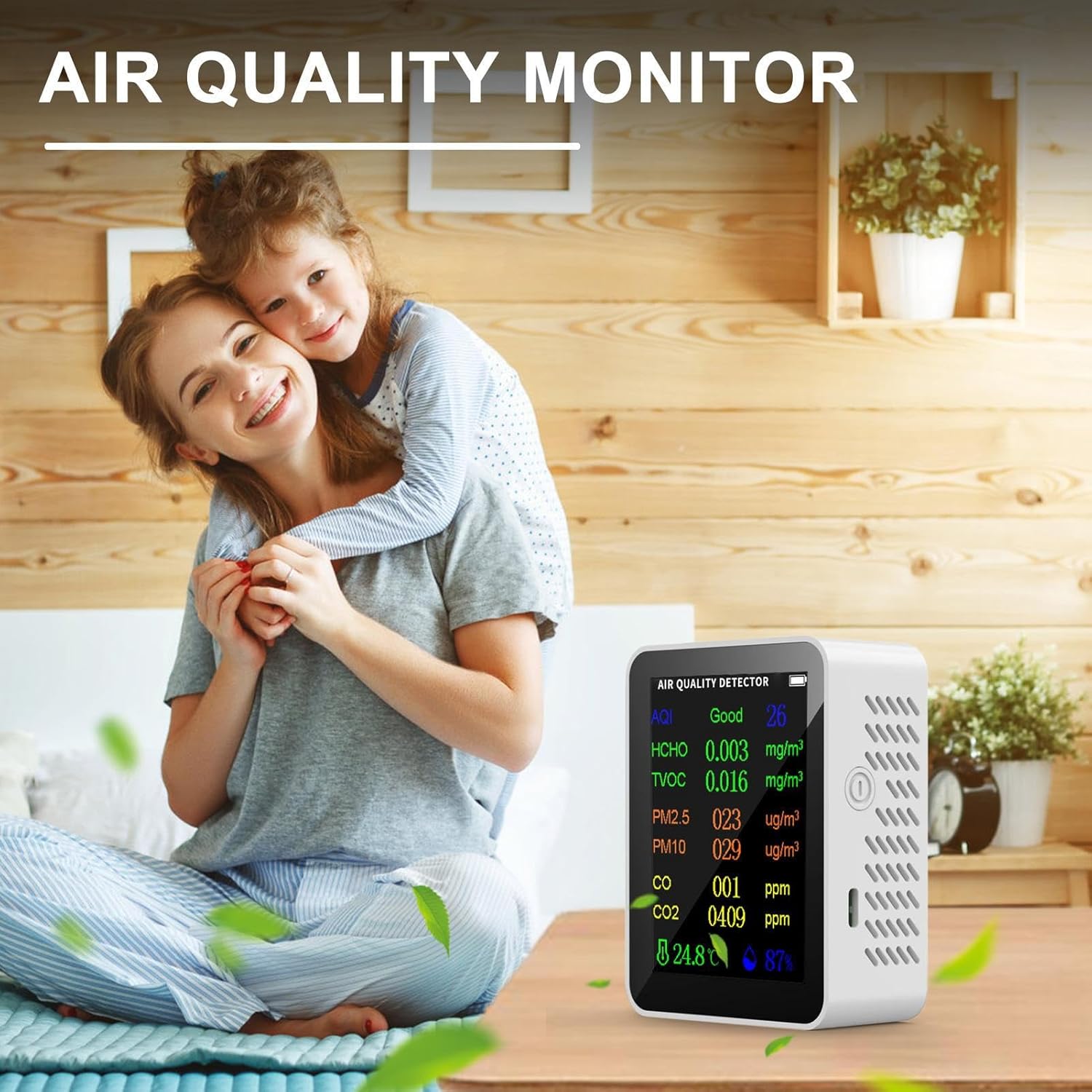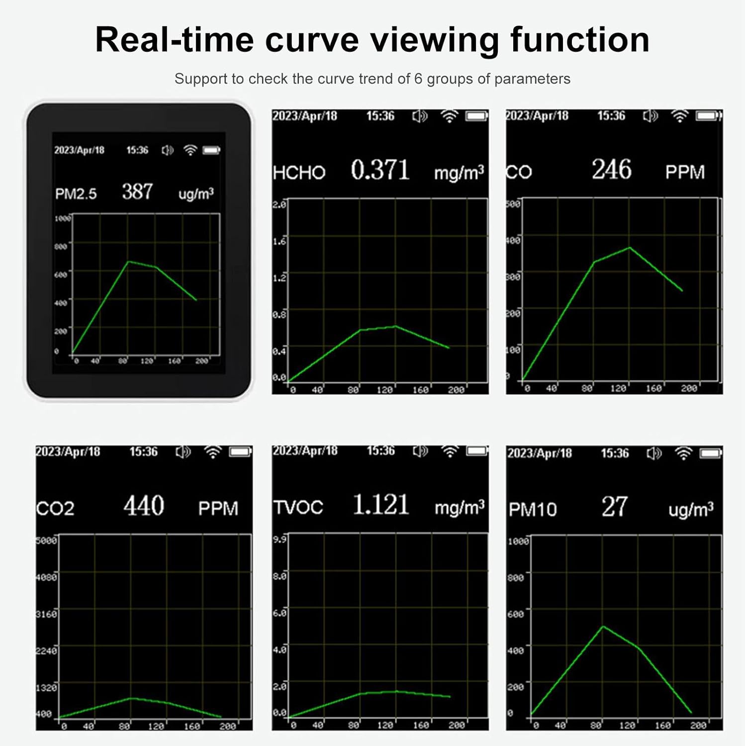 Amplia Gama de Usos: Con Detección 10 en 1 (Monóxido de Carbono, Formaldehído, Dióxido de Carbono, Humedad, PM2.5, PM10, Temperatura y Otros Contaminantes) para el Monitoreo Integral de la Calidad Del aire Inside, asegurando