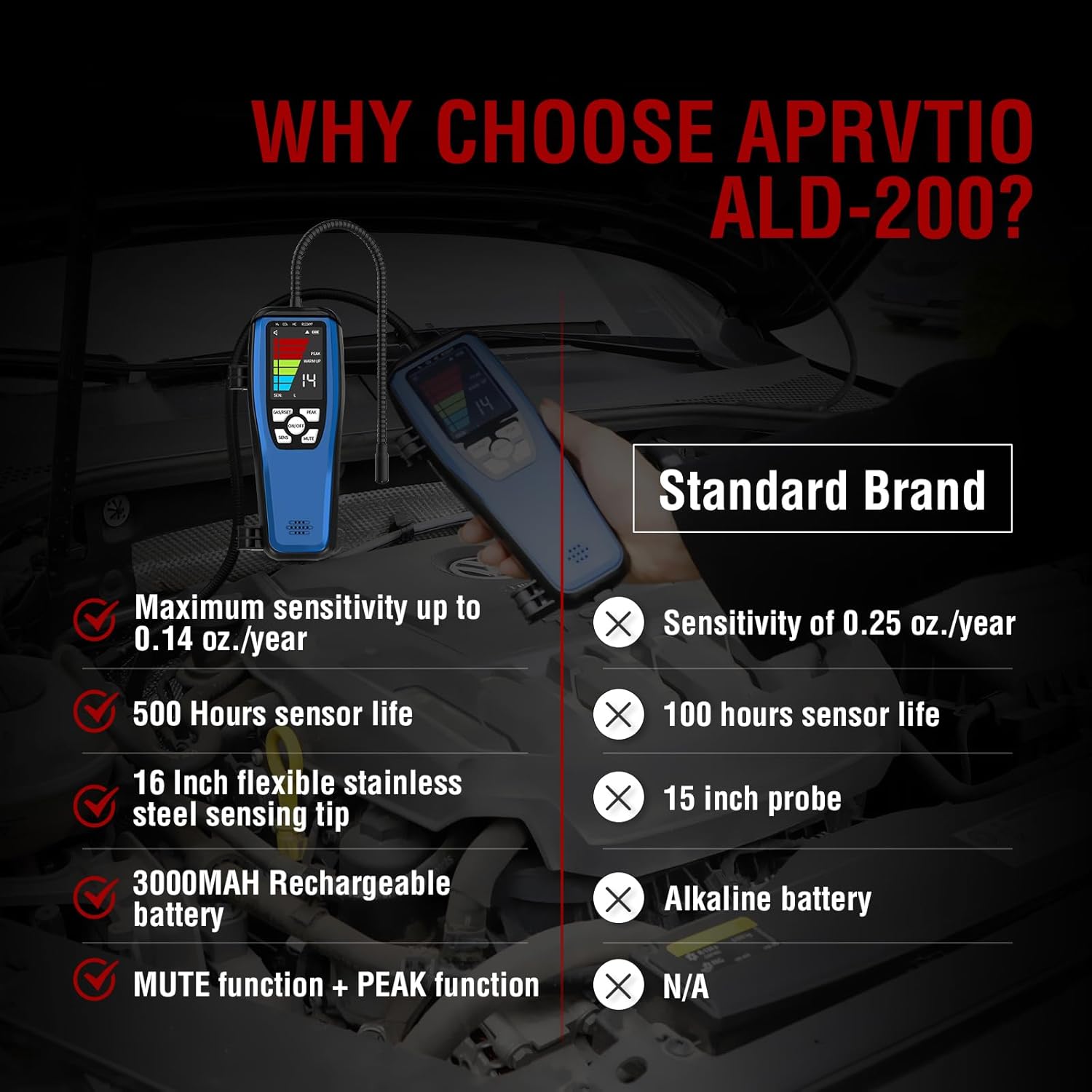 【𝐂𝐡𝐢𝐜𝐢𝐨𝐬 𝐝𝐞 𝐥𝐚 𝐒𝐞𝐧𝐬𝐢𝐭𝐢𝐯𝐢𝐭𝐲 𝐞𝐥 𝐀𝐝𝐣𝐮𝐬𝐭𝐚𝐛𝐥𝐞𝐬】 𝐀𝐝𝐣𝐮𝐬𝐭𝐚𝐛𝐥𝐞𝐬】 en comparación con los detectores de fugas de freón tradicionales, el detector de fugas de ca ald-200 es más preciso y menos susceptibles a la interferencia de los gases. 3 Modos de Sensibilidad con una Sensibilidad Máxima de Hasta 0,14 oz/año. Sondas de Sensor de 16 Pulgadas del detector de fugas de hvac que le permiten Llegar a áreas difunos de Alcanzar.