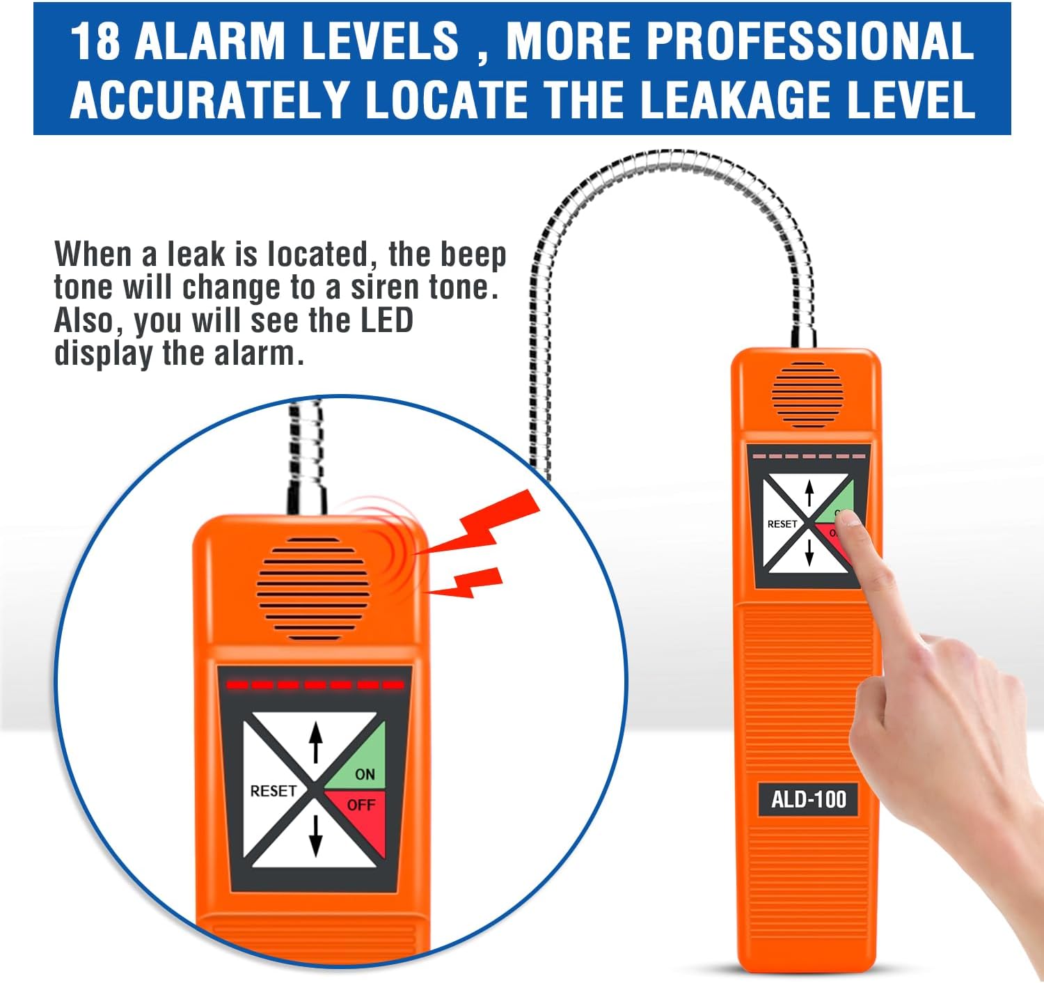 【18 Niveles de indicaciones de alarma】 El detector Electónico de fugas de refrigerante cuenta con 18 niveles dearma de baJo a alto para ayuda un detectar una fuga. El Nivel de Alarma Aummará A Medida Que Se Acerque a la Fuga.