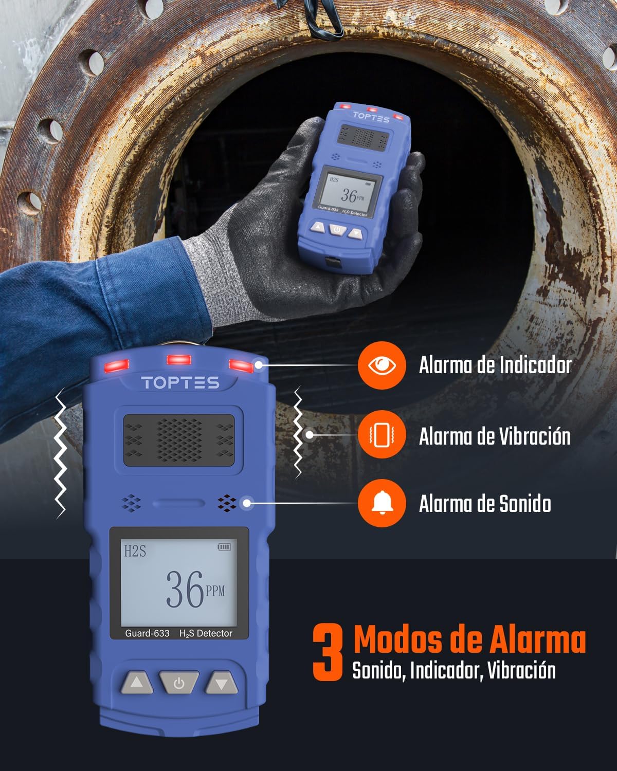 Sensor de alta precisión, respuesta rápida: El detector de H2S Guard-633 cuenta con un sensor de alta precisión que detecta niveles de sulfuro de hidrógeno en 0,5 segundos, lo que proporciona un monitoreo eficiente y estable. Certificados de calibración y documentos de certificación incluidos.
