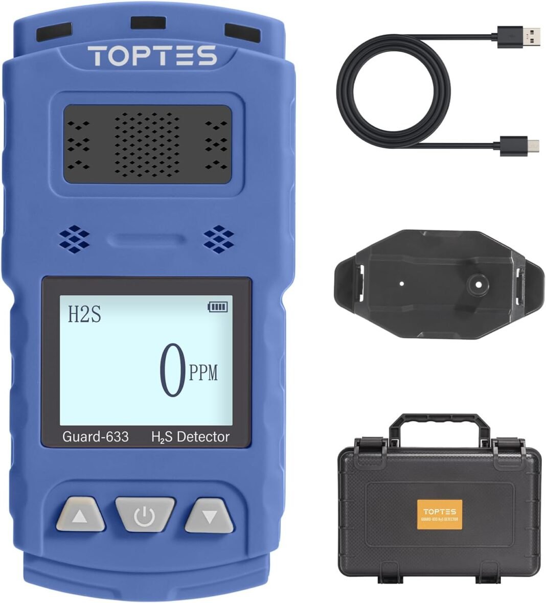 Lo que obtienes: el detector de fuel de sulfuro de hidrógeno Guard-633 incluye un detector de H2S Guard-633, una caja de embalaje, un guide del usuario, un cable de carga y una campana de fuel estándar.
