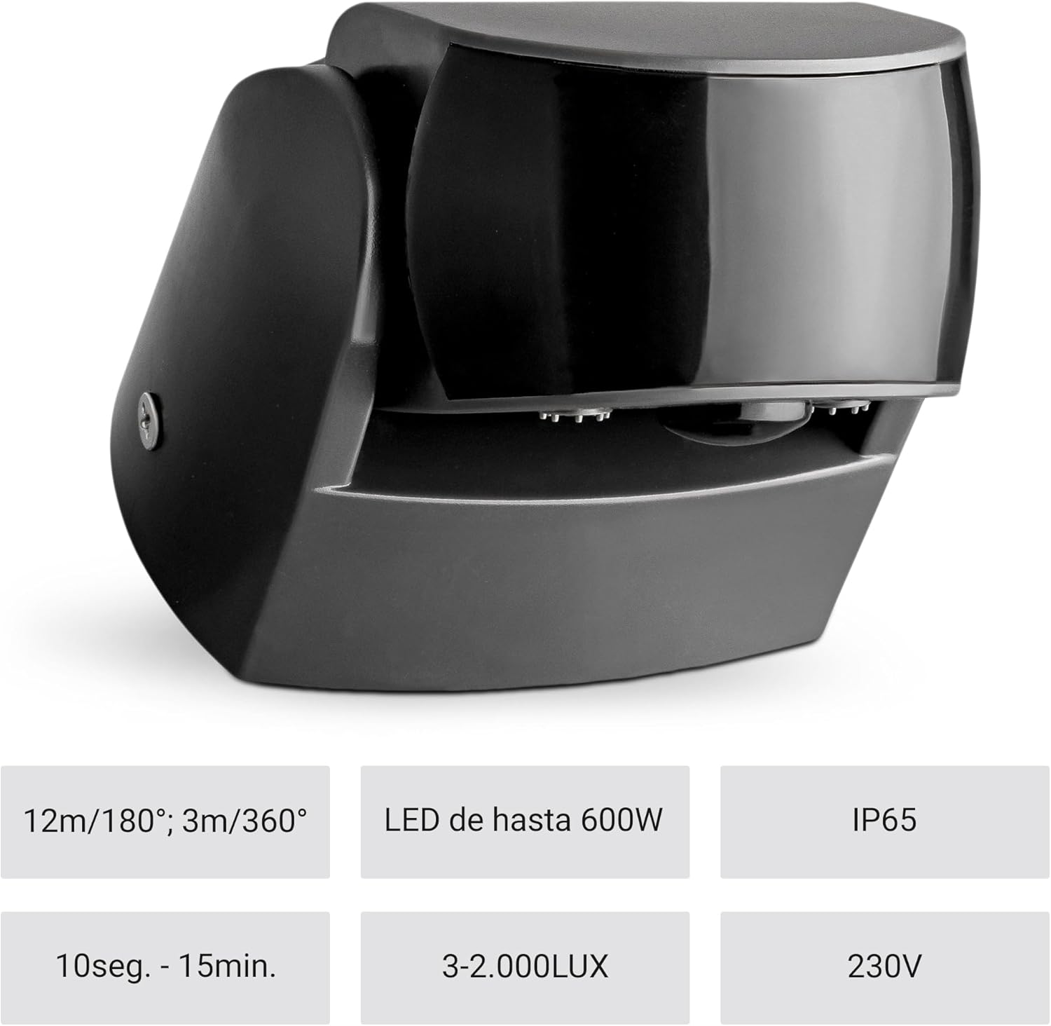 El detector de Movimiento Puede inclinarse vertical 180 °. El Tiempo de Conexión es de 10 Segundos Hasta 15 Minutos. El detector de Movimiento También inclinable Puede Ajustarse Según la Luz Ambiental (en un intervalo entre 3 y 2.000 lux).