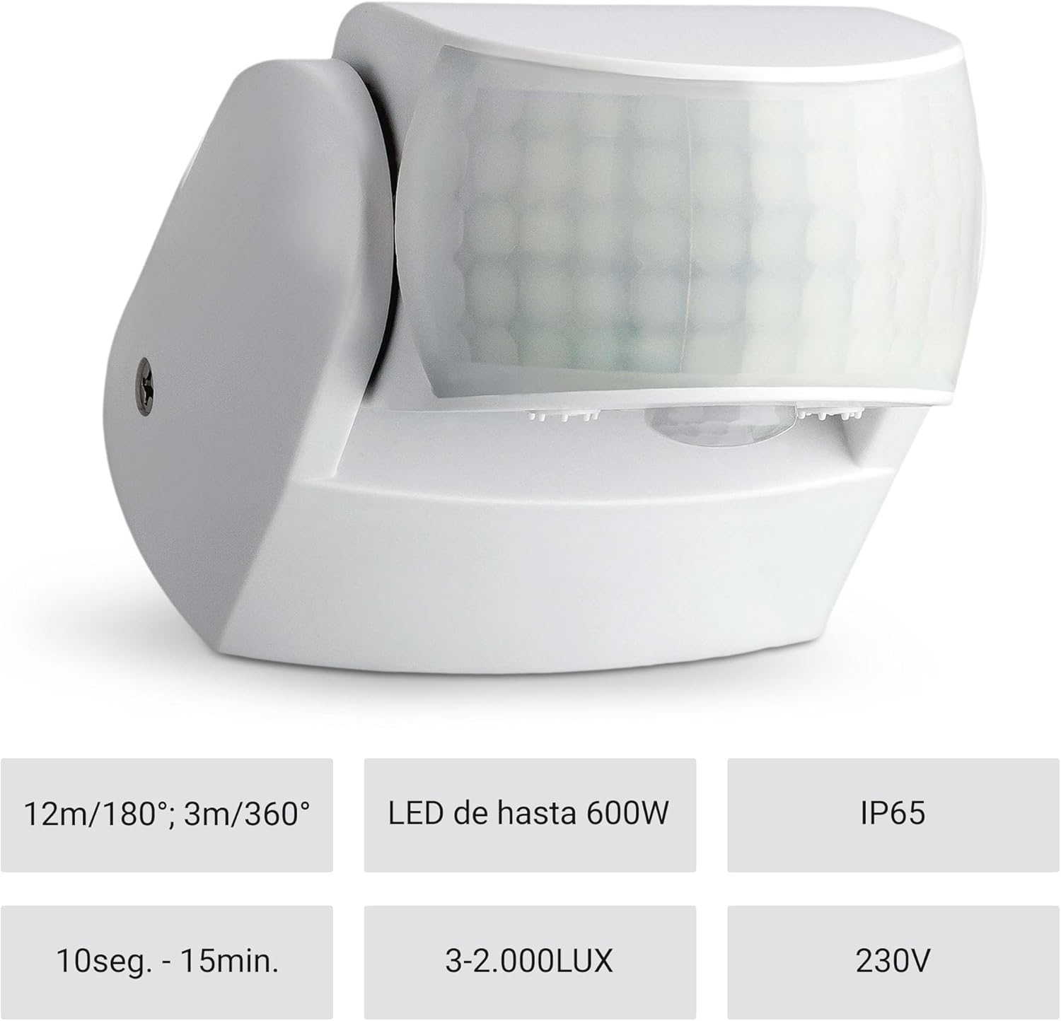 El detector de Movimiento Puede inclinarse vertical 180 °. El Tiempo de Conexión es de 10 Segundos Hasta 15 Minutos. El detector de Movimiento También inclinable Puede Ajustarse Según la Luz Ambiental (en un intervalo entre 3 y 2.000 lux).