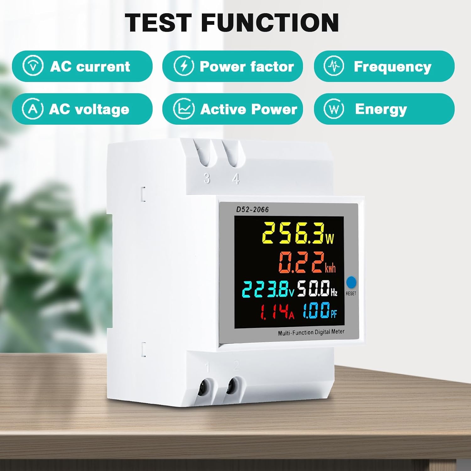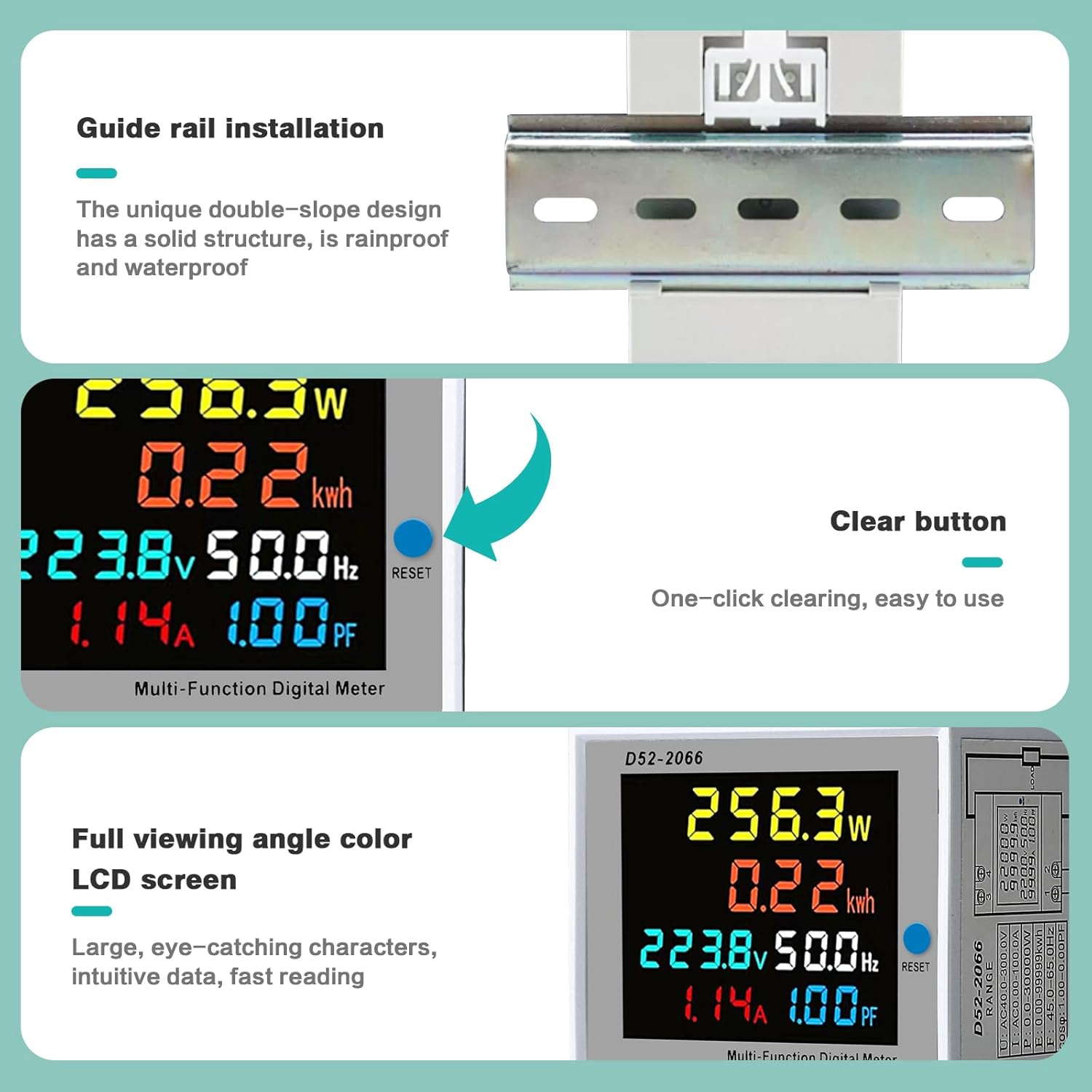 【Pantalla LCD de alto colour】: contador eléctrico, 6 colores de visualización diferentes, 178 ° campo de visión sin puntos ciegos, medidor de energía digital con función de luz de fondo, lo que simplifica la visualización de datos.