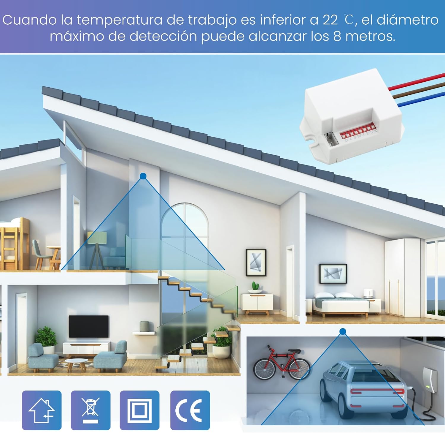 【Gran rango de detección】: El inside del mini interceptor del sensor inferrojo está diseñado para interiores (detectores de techo), con un diseño de instalación integrado, fácil de instalar, rápido y muy adecuado para la instalación de techo. También se puede instalar en pantallas, paredes y cajas de unión.