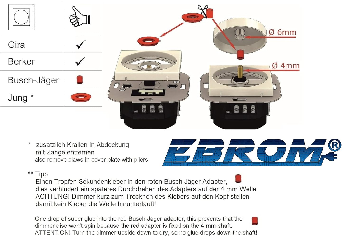 EBROM LED DIMMER 1001, adecuado para bombillas LED regulables, controladores LED regulables, bombillas incandescentes, lámparas halógenas HV y NV con transformador electrónico. Tecnología silenciosa, silenciosa. Mínimo ajustable. y Máx. Área de atenuación sin parpadeo, protección electrónica contra sobretemperatura/cortocircuito y sobrecarga con reactivación automática. Sin consumo de energía (verdadero interruptor de encendido y apagado). Fabricado en Alemania. En el producto recibirá 5 años de garantía de EBROM, durante este tiempo puede informarnos del producto defectuoso y, si hay un error, cambiaremos el producto defectuoso por un producto impecable. El período de garantía comienza con la entrega del producto al cliente. La garantía es EBROM Thomas Schmolinski & Sven Wiechers GbR, Forststr. 4a, 83123 Amerang. Esta garantía solo se aplica a clientes con sede en la Unión Europea. Además, usted tiene los derechos bajo la responsabilidad authorized por defectos como consumidor, estos derechos pueden ser ejercidos contra nosotros sin restricciones e independientemente de nuestra garantía.