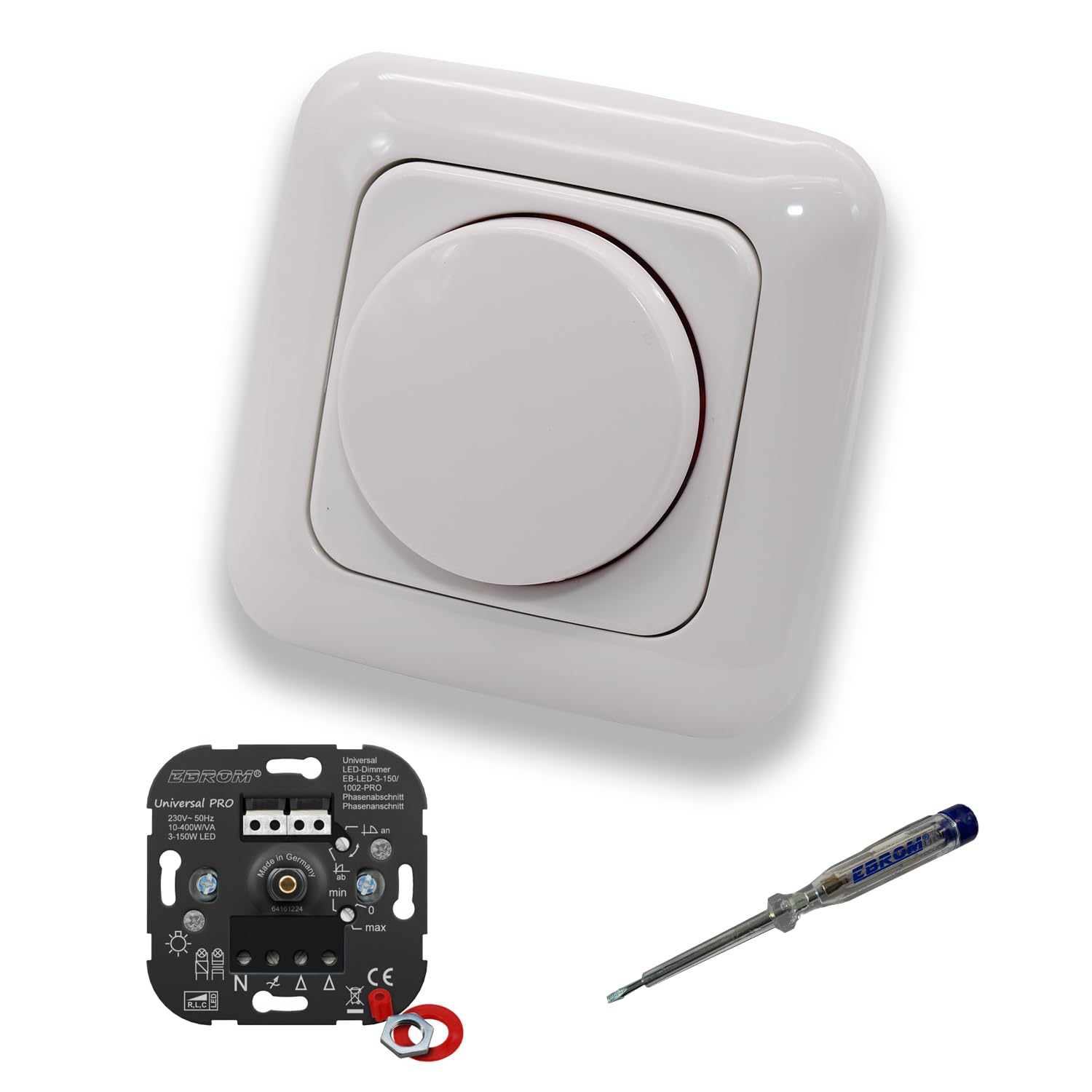 Ebrom Common Professional 1002 – Regulador de intensidad LED empotrable De 3 a 150 W (por ejemplo, también varios LED de 3,5 W en una lámpara) también para lámparas halógenas incandescentes, HV y NV con transformador electrónico de 10 a 400 W. Trabajo Absolutamente silencioso, sin zumbidos ni zumbidos. Dimensiones: 71 x 71 x 33 mm, 230 V ~, 50 Hz