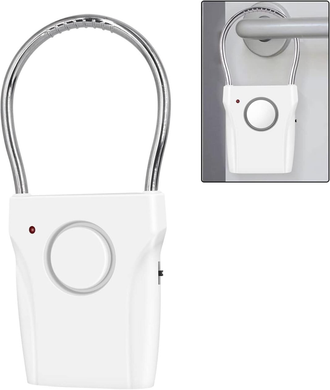 Cuando lo enciendes, hay una luz roja parpadeante, que continuará parpadeando durante unos 10 segundos, lo que te permitirá configurarlo y moverte antes de que se arme. Una vez que la luz deje de parpadear, estará listo. Cuelga la alarma en la manija de la puerta. Cuando alguien abre la puerta o toca la manija de la puerta, la alarma enviará un volumen de alarma de 120 dB para incitar a alguien a invadir. El sonido de la alarma se puede escuchar a una distancia de 500 pies.