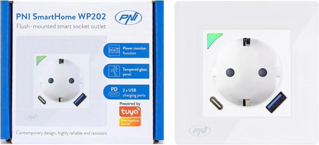 El PNI WP202 ES Un enchufe Inteligente Incorporado Con Marco de Vidrio Templado y ABS Resistente al FUEGO, Alimentado A 230V y Capaz de Soportar una Corriente Máxima de 16a.