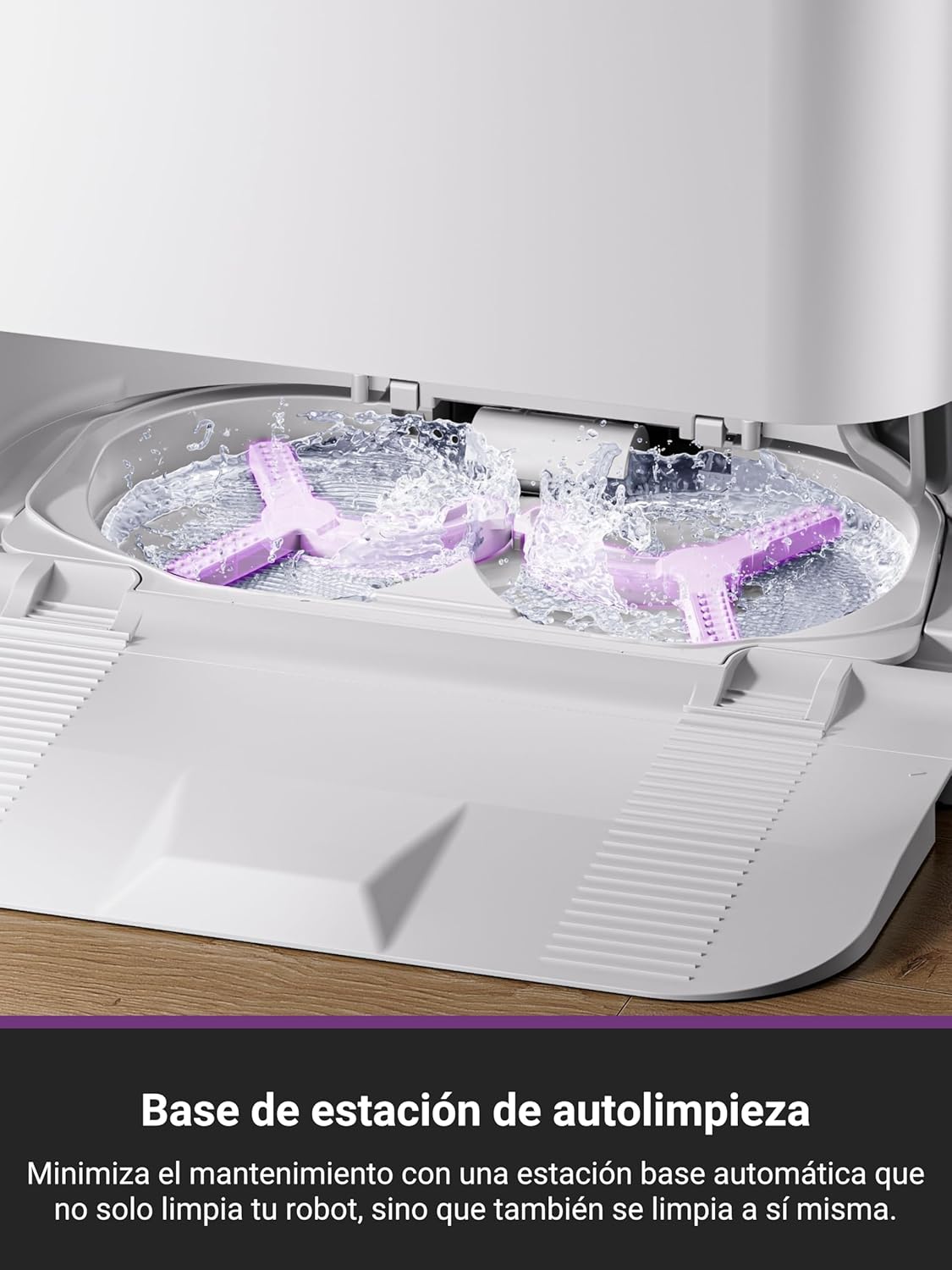 Estación Base Autolimpiable y Lavado de Mopa con Agua Caliente: Mantenimiento sin manos con el robotic aspirador autovaciado Eureka J15 que automatiza el lavado de la mopa con agua caliente a 75°C y la estación base autolimpiante que vacía el cubo de la basura y seca la mopa.