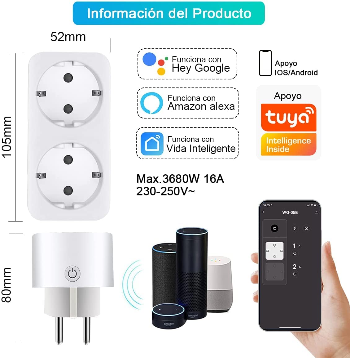Diseño funcional Con el enchufe inteligente doble puedes optar por 2 bases en una sola ranura, ahorrando espacio y puedes conectar 2 dos aparatos donde antes solo podías uno. Puedes controlar los dos enchufes juntos o por separado mediante la aplicación, o utilizar el interruptor para encenderlos o apagarlos. Management remoto y por voz El enchufe inteligente Extrastar es suitable con Alexa, Google Assistant, good life, puede controlar el enchufe por voz. Con el enchufe Wi Fi cuando estés fuera de casa podrás desconectar cualquier dispositivo que esté conectado al enchufe de forma totalmente remota. Programable Podrás programar el enchufe wifi según las necesidades que tengas haciendo que los dispositivos que estén conectados al reliquate sean tu fuente en los horarios que desees. Por ejemplo, podrás programar el purificador de aire de 10 a 2 µm, que el aparato antimosquitos se pague en dos horas o que la cafetera esté conectada a las 8 de la mañana. Conexión fácil Con una conexión Wi Fi de alto rango, el enchufe wifi Exastar puede alcanzar un rango de conexión Wi Fi más largo y disminuir la tasa de desconexión. Funciona con cualquier enrutador Wi Fi de 2,4 GHz. Al conectar el producto, seleccione 2,4 GHz.