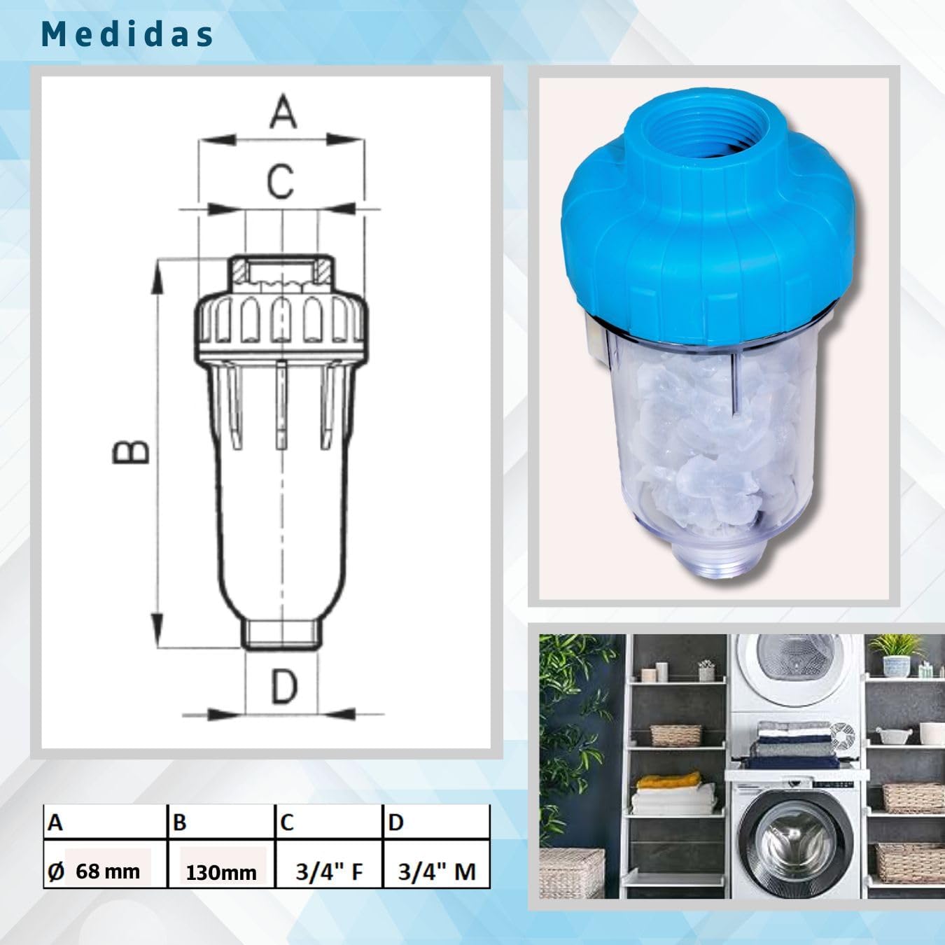Mejora la Eficiencia y Durabilidad de tus Electrodomésticos con el Filtro Antical con piedras de Polifosfatos. Nuestro filtro antical descalcificador casa, diseñado específicamente para su uso en lavadoras y lavavajillas, representa una solución técnica avanzada para abordar el problema común de la acumulación de cal en estos dispositivos de uso doméstico. Este filtro incorpora una carcasa robusta, confeccionada cuidadosamente con materiales plásticos de alta resistencia que asegura una prolongada vida útil del filtro, incluso en entornos de funcionamiento continuo.