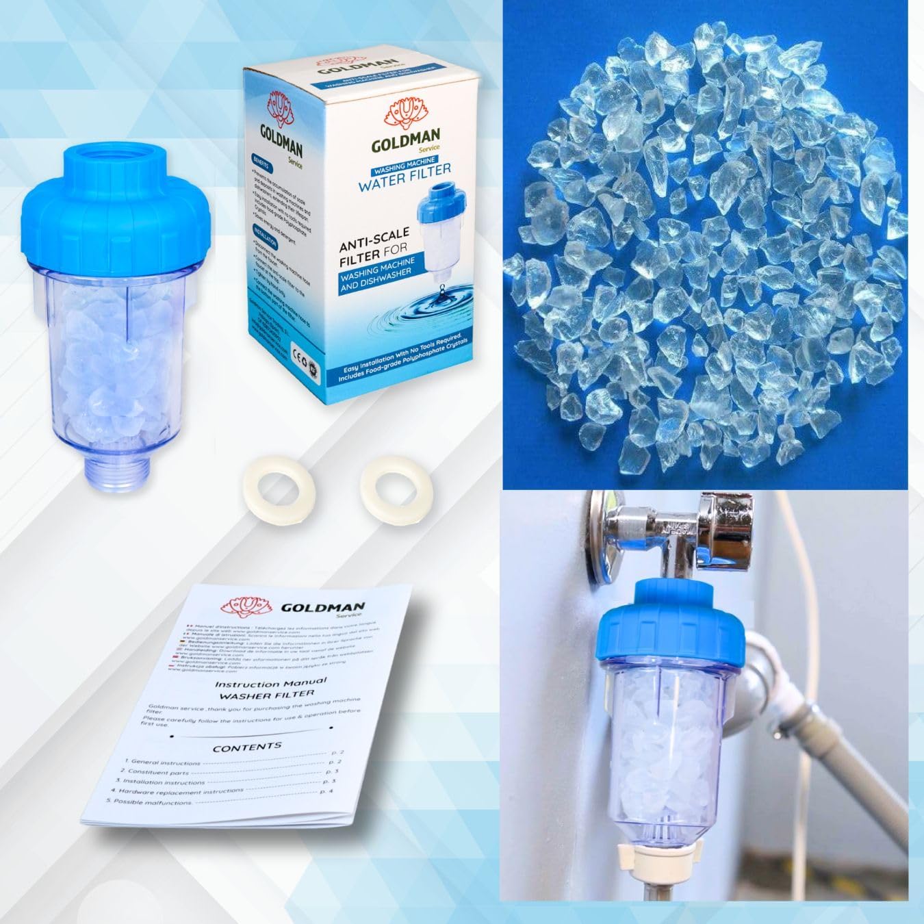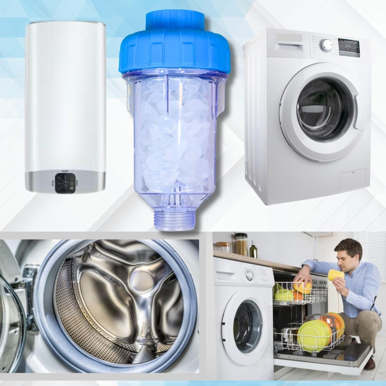 ✅USOS: Filtro agua grifo protector de electrodomésticos, previene la acumulación e incrustaciones de cal, mejora la eficiencia de los aparatos. Gracias a sus piedras de polifosfatos liberadas en el filtro mejoran la calidad y eliminan impurezas del agua filtrada industrial, alargando la vida de tu lavadora y lavavajillas.