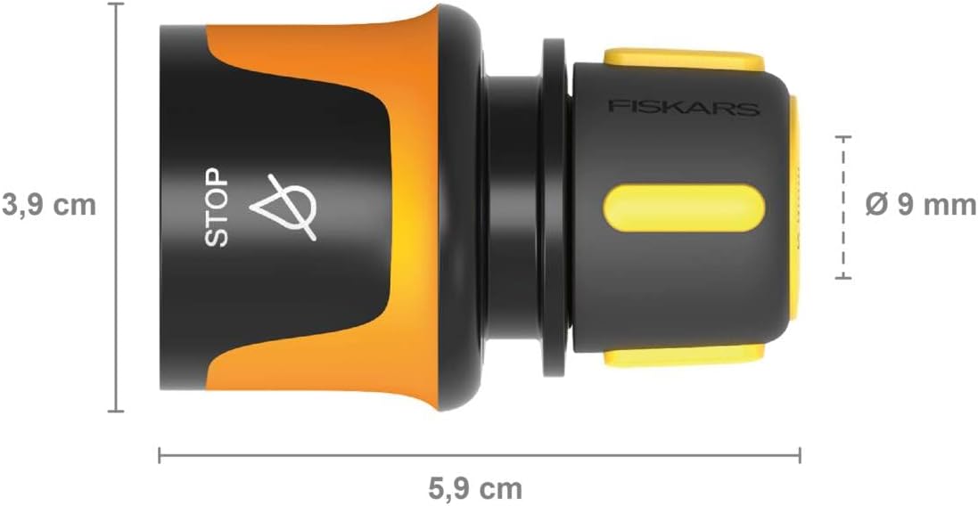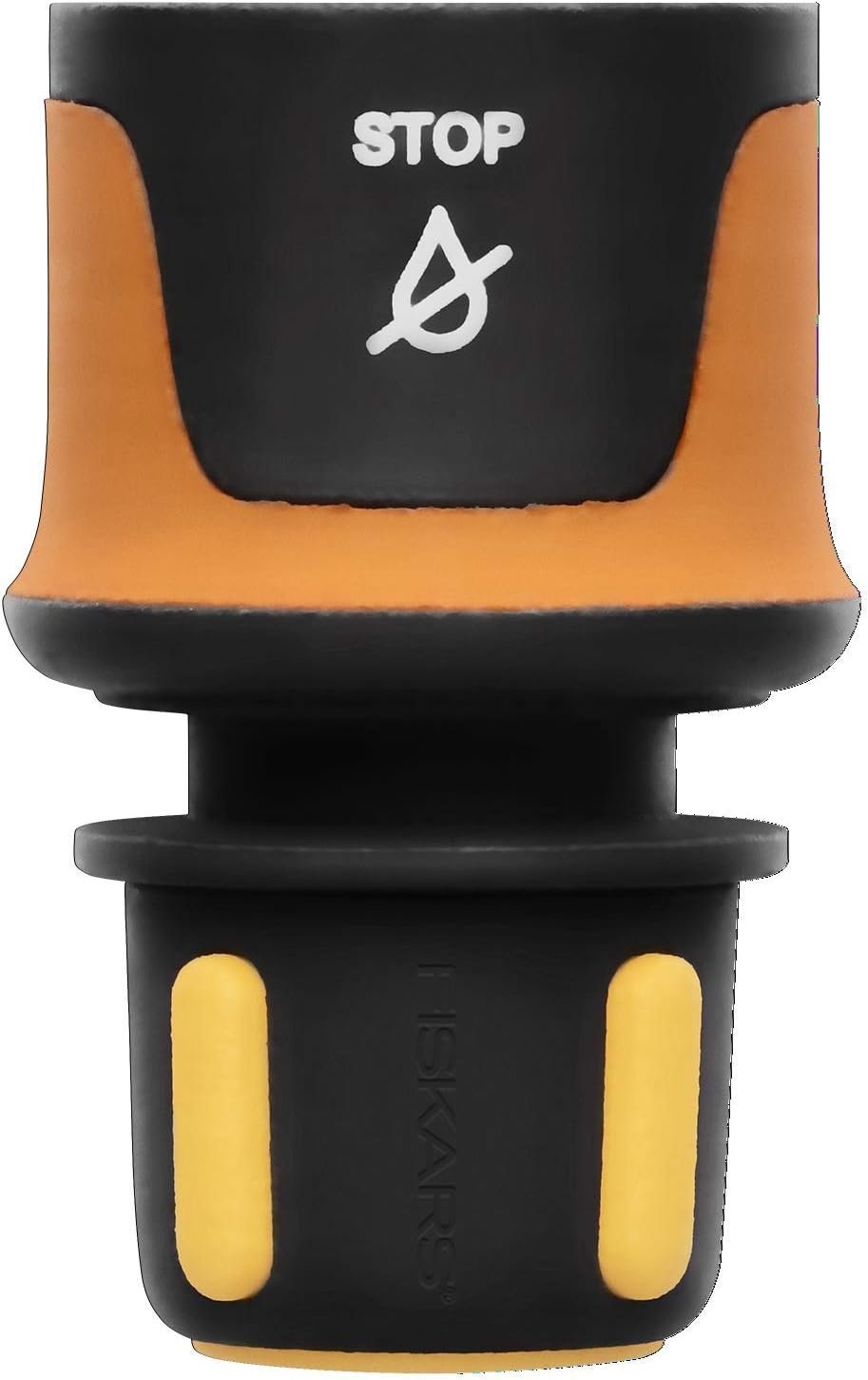Fiskars Conector de manguera, Tamaño common, Ø 9 mm (3/8″), Puntos de contacto SoftGrip, 30 g, Negro/Naranja/Amarillo, STOP, 1027078