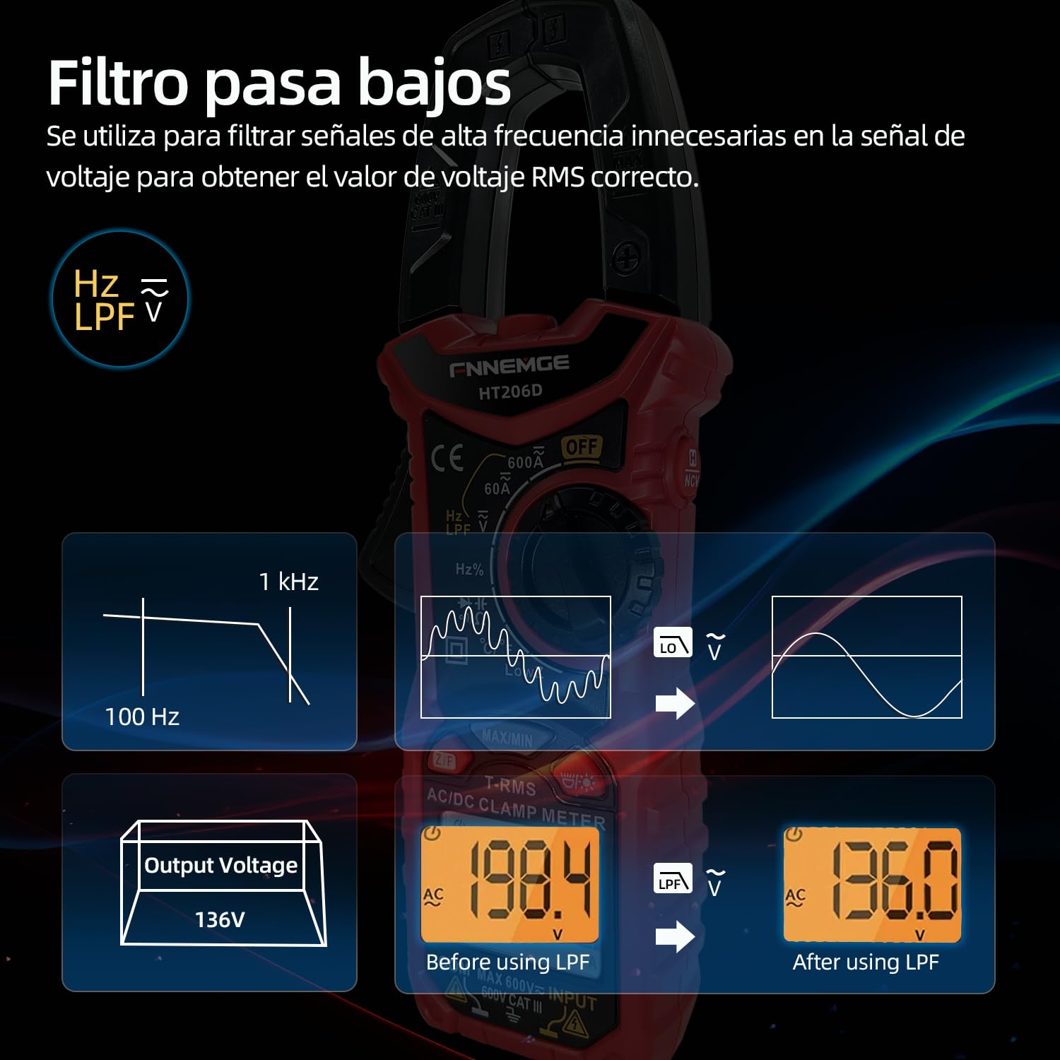 【LPF y LowZ】El filtro de paso bajo (LPF) se utiliza para suprimir la señal de alta frecuencia mediante absorción de capacitancia y bloqueo de inducción. La función LowZ (baja impedancia) evita mediciones erróneas debido a un voltaje incorrecto.