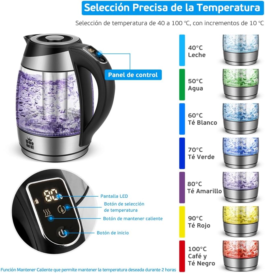 Siete colores de iluminación LED. Cambiando el colour de los LED en función de la temperatura. Cuando el hervidor calienta el agua, la iluminación LED cambia de colour 7 veces, en la siguiente secuencia: blanco, verde, celeste, azul, morado, amarillo y rojo.