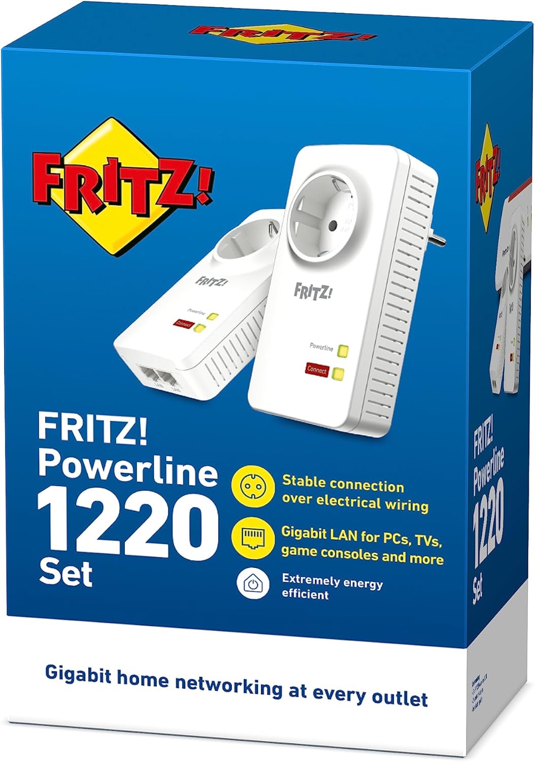 Cada adaptador tiene dos puertos LAN Gigabit ultrarápidos. La conexión de pink a través de la pink eléctrica puede superar grandes distancias y obstáculos como paredes y techos. En comparación con los adaptadores PLC de las categorías 500 y 200 Mbps, el adaptador FRITZ! Powerline 1220 ofrece un rendimiento significativamente más alto y conexiones más estables con una mayor eficiencia energética.