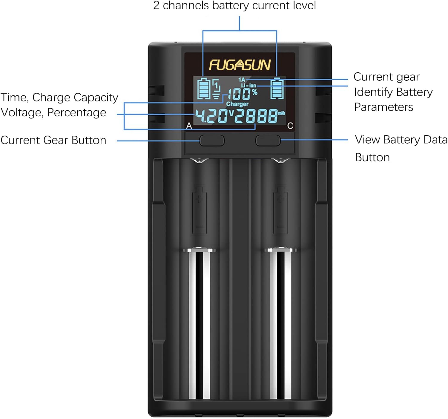 Ranura larga: este cargador tiene una ranura de 75 mm, puede admitir una batería de menos de 75 mm, como una batería 21750 21700 20700 26700 26650 18650 con placa de protección PCB. Para que pueda cargar la batería de su linterna LED y otros electrodomésticos.
