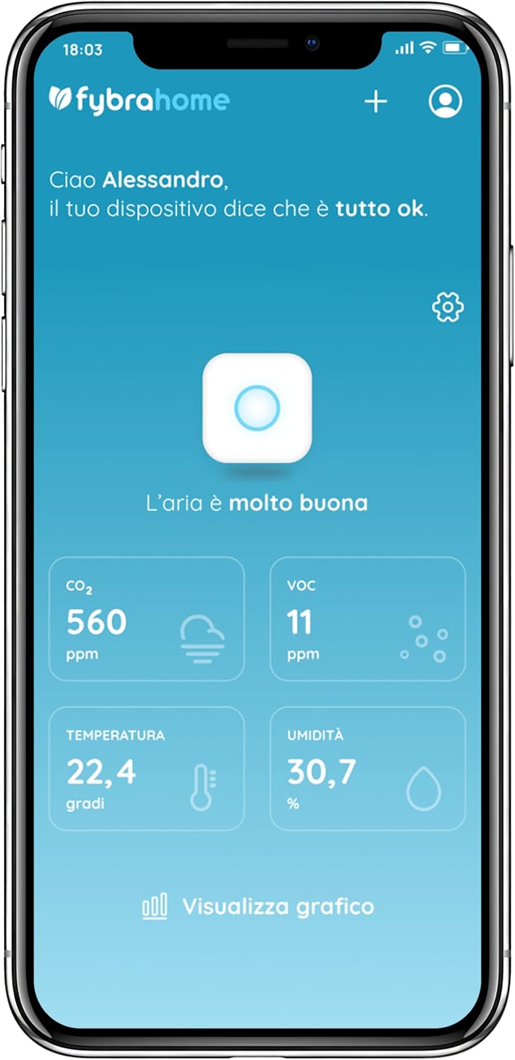 El algoritmo Inteligente se adapta a tus hábitos y monitorea en tiempo actual Los Niveles de CO2, Temperatura, Humedad y Compuestos Orgánicos Volátiles, Voc.