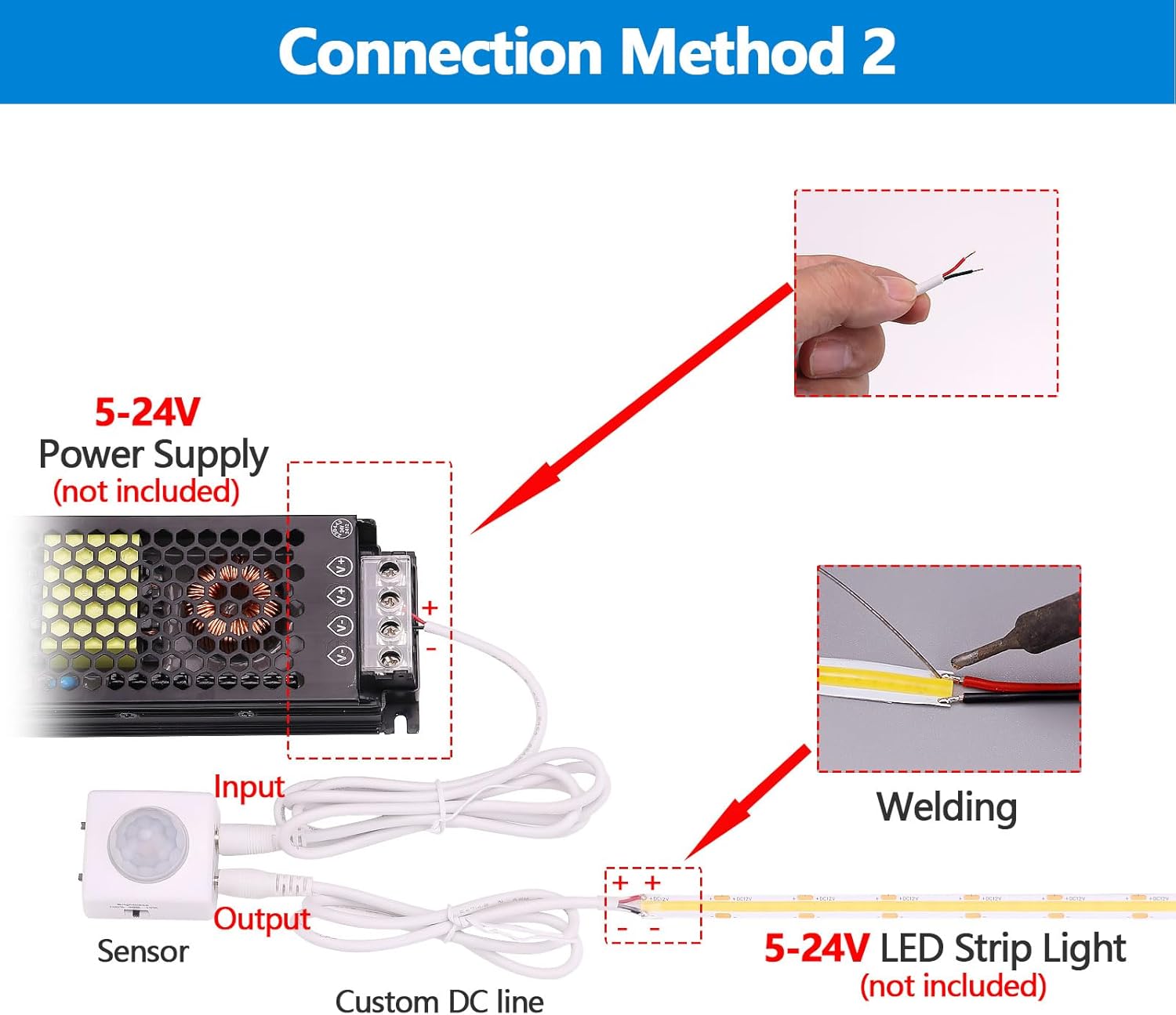 【Recordatorios】El sensor debe estar conectado a una fuente de alimentación para que funcione correctamente. El puerto «INPUT» del sensor se conecta a la fuente de alimentación y el puerto «OUTPUT» se conecta a la tira LED. No conecte el sensor directamente a voltajes distintos de 5-24V, ya que el alto voltaje puede dañar el sensor.