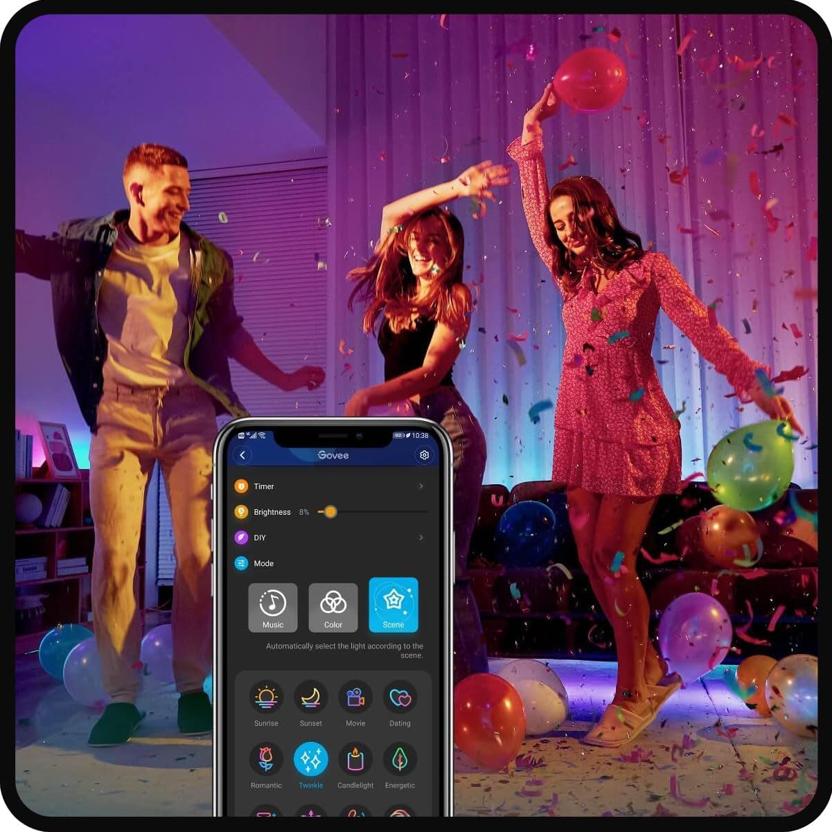 Múltiples modos de escena: LED inteligente Bluetooth RGB para exteriores permite personalizar completamente tus tiras de luces. Con tu audio favorito con modo de música para explorar más de 64 modos de escena preestablecidos para que coincida con tu ambiente.