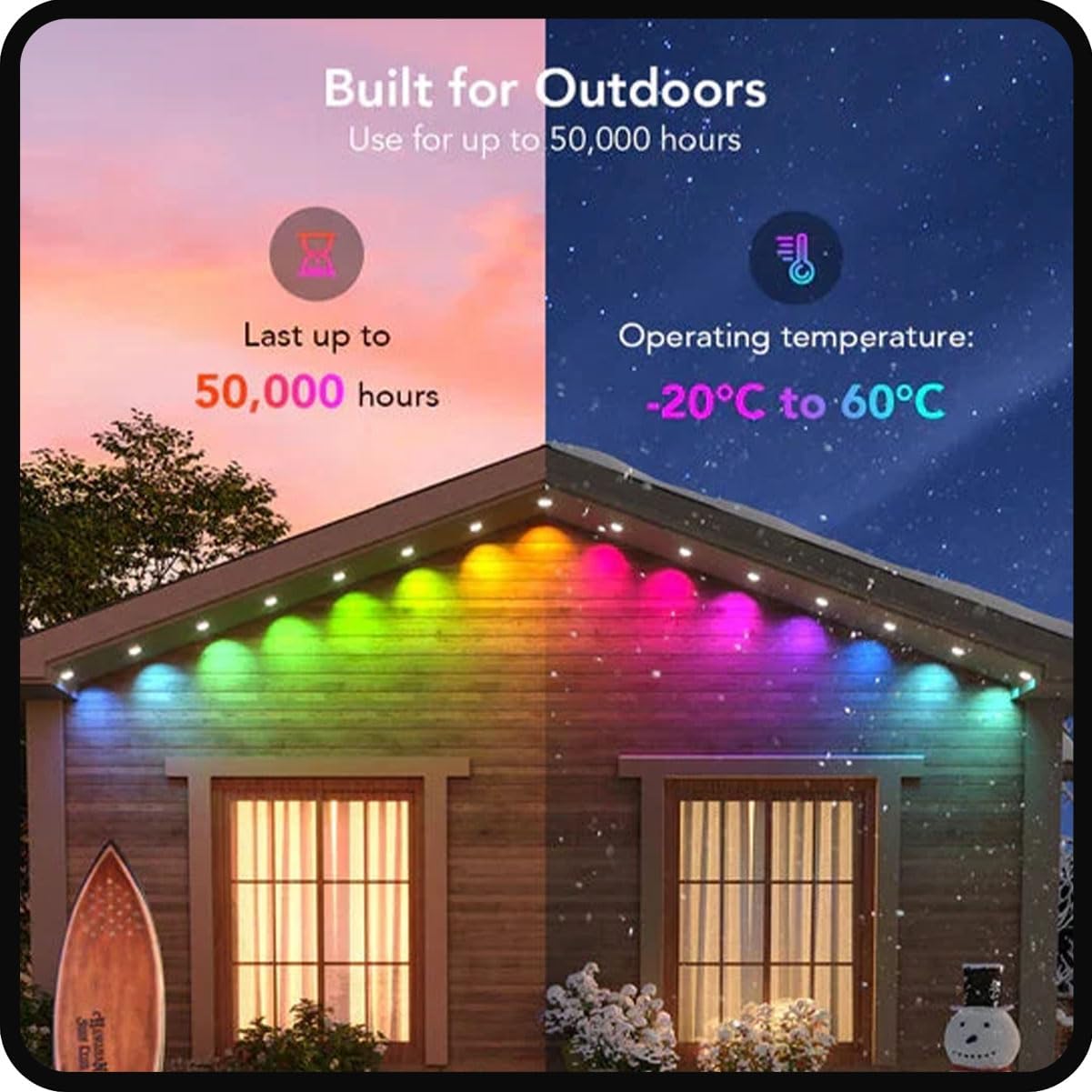 Wi-Fi Bluetooth LED inteligente RGB-IC para exteriores: luz LED permanente para exteriores Good Rainbow elimina la molestia estacional de poner y quitar las luces, y saluda al brillo sin esfuerzo que trasciende el espíritu navideño. Con la iluminación permanente inteligente para exteriores, tu hogar se convierte en un faro de alegría, cautivando al vecindario sin ningún inconveniente.