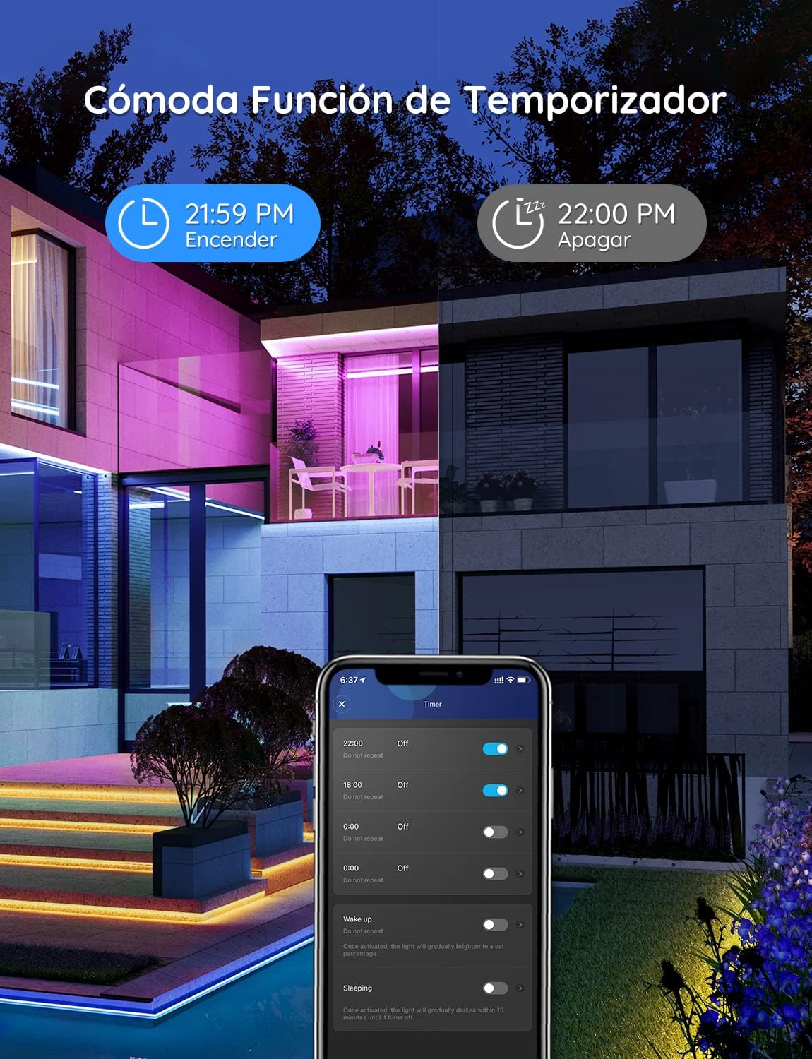 Sincronización con música: Como decoración navideña, el micrófono incorporado permite que las tiras de luces LED para exteriores se sincronicen con cualquier tipo de música. Vea cómo las luces de su patio bailan al ritmo de sus canciones favoritas. Celebre con su familia en su patio en Pascua.