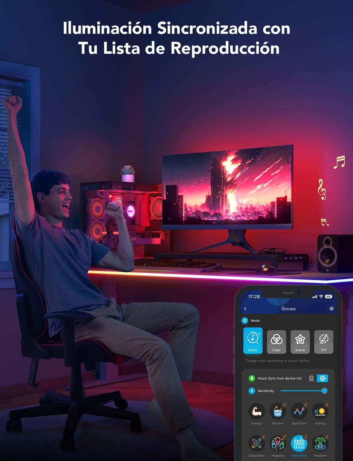 Activación Inteligente: Gestiona tus tiras de luces LED gaming para escritorios con simples comandos de voz a través de Alexa y Google Assistant. Elige entre 16 millones de colores DIY, más de 64 modos de escena, 11 modos de música y mucho más con un easy toque en la aplicación Govee Residence.