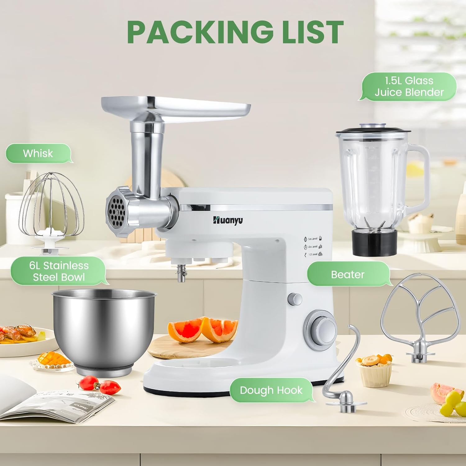 【Batidora amasadora 3 en 1】 ¡La batidora de masa multifunción está equipada con una picadora de carne y una batidora de jugo de vidrio de 1,5 litros, que puede satisfacer la mayoría de sus necesidades de cocina en casa! Puedes crear tu propia cocina a partir de pan, pasteles, galletas, zumos, salchichas y carne.
