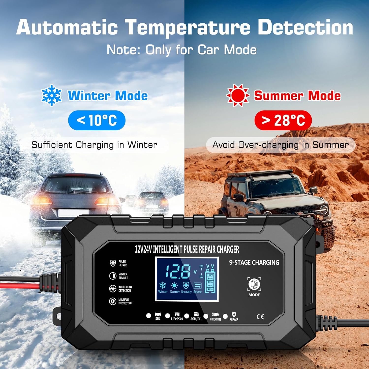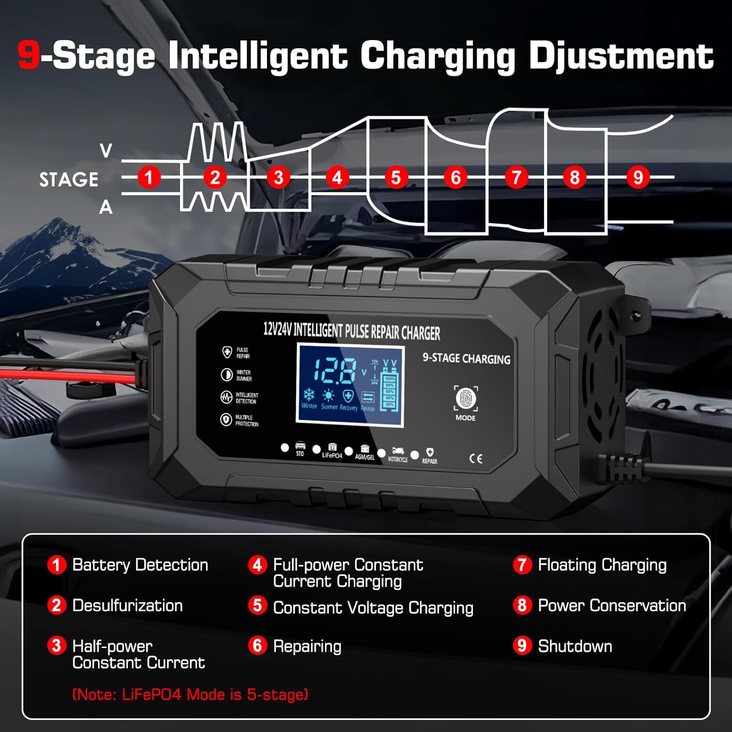 【Reparación de pulsos y mantenimiento a largo plazo】: El 15A cargador de baterias coche y moto no solo puede ajustar el voltaje y la corriente, sino que también tiene un modo de reparación que puede reparar baterías viejas, restaurar el rendimiento y extender la vida útil. Durante el almacenamiento, cuando el voltaje es inferior a 12 V, la batería puede mantenerse continuamente en un estado de carga completa, por lo que tendrá suficiente energía cuando regrese de vacaciones.
