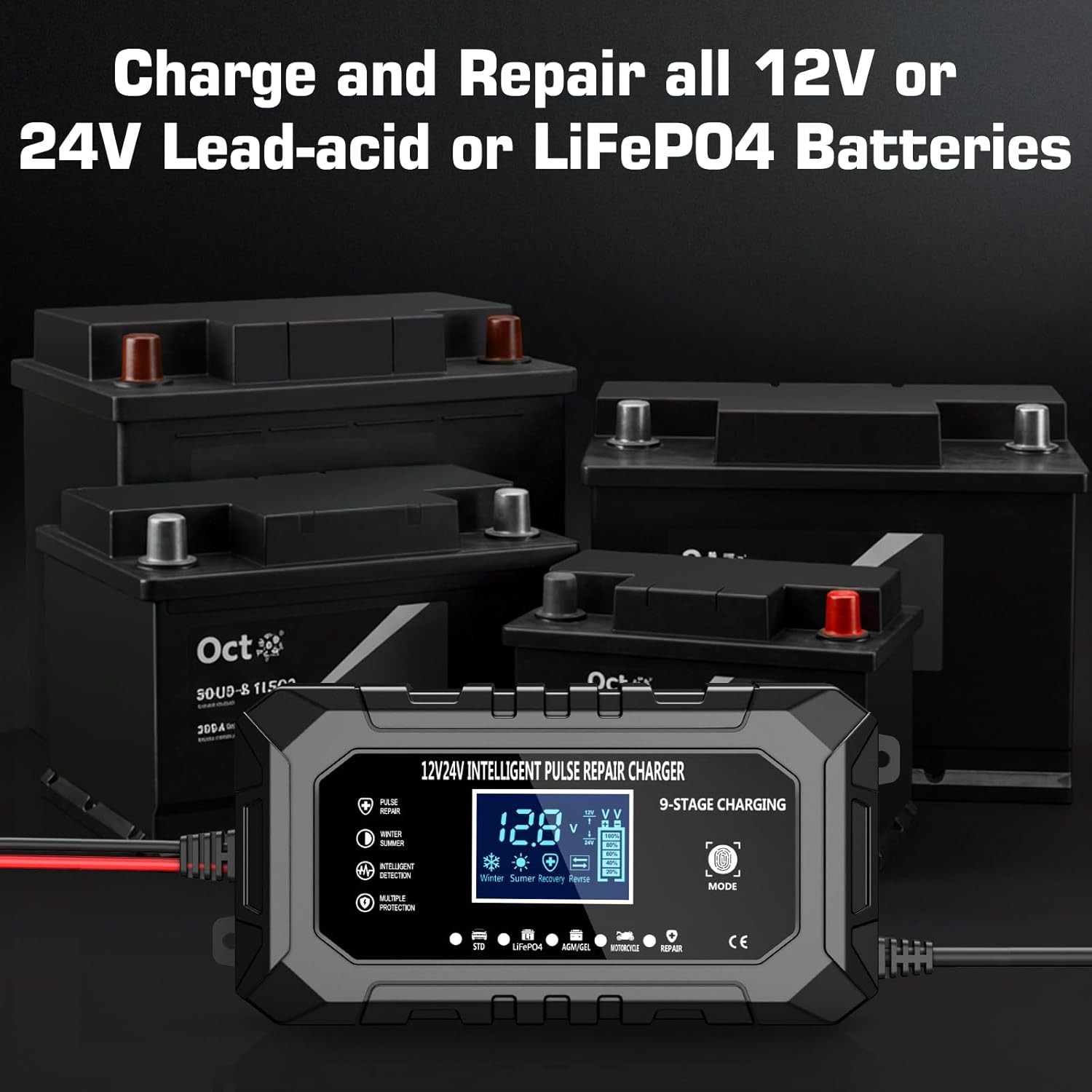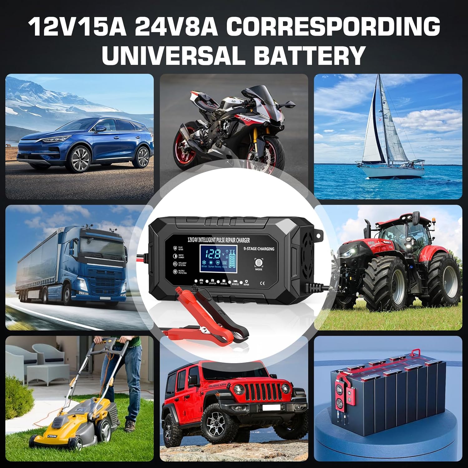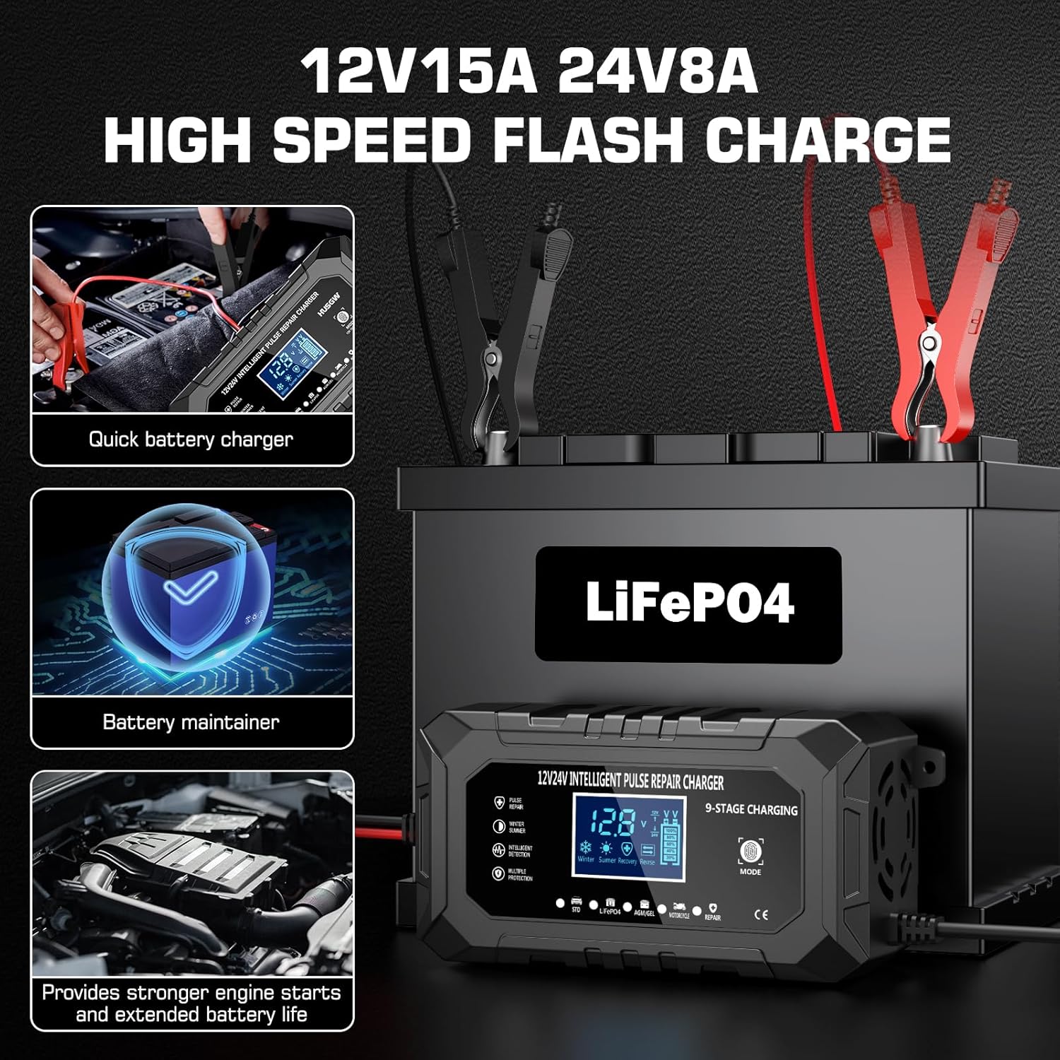 【Cargador Rápido de Batería de Plomo-ácido LiFePO4】: Salida de voltaje twin de 12 V/15 A y 24 V/8 A, 50 % más rápido que el cargador regular de 8 A/10 A, activa fácilmente baterías LiFePO4, AGM, Gel e inundadas. Adecuado para baterías de plomo-ácido de 12 V 2 Ah-200 Ah/24 V 2 Ah-100 Ah, baterías de fosfato de hierro y litio LiFePO4.