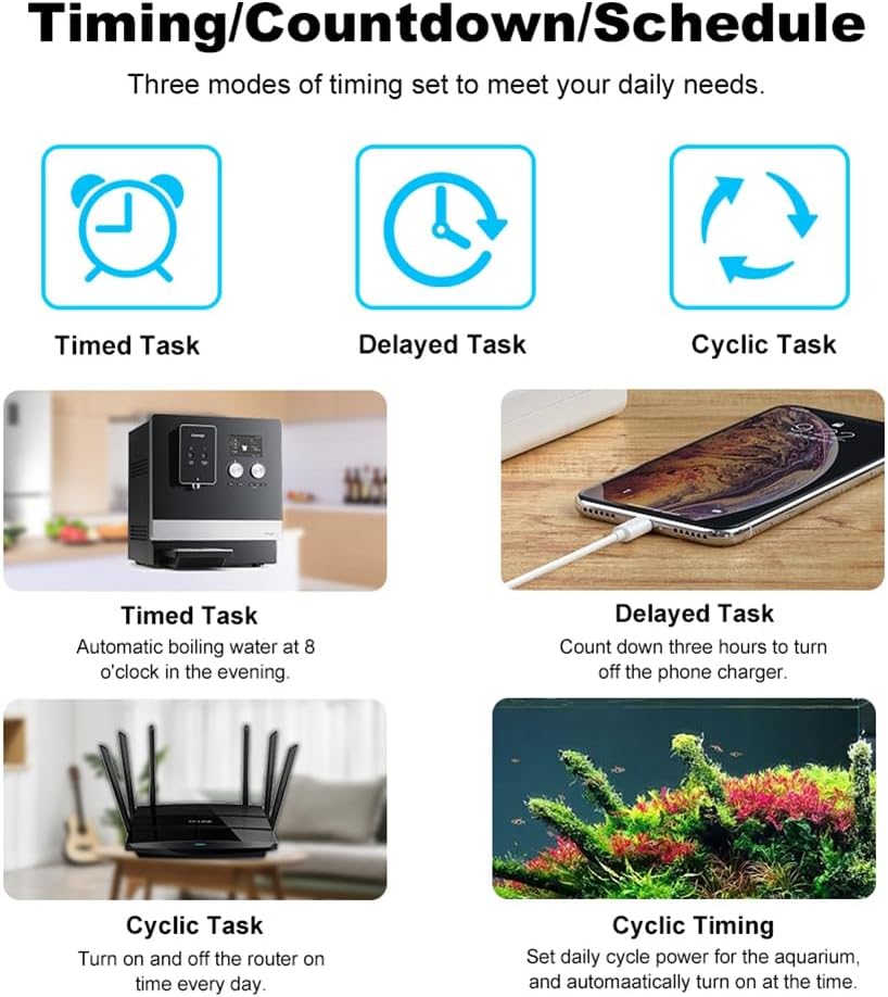 Función de Temporizació: El Temporizador Se Puede Configurar Fácilmento Según ProPias Necesidades. Es Más Conveniente Configuración ParA Usted Un Cronograma para Ejecutar el Complemento Auticamete. Desfruta de una Vida Inteligente que le le ahorrarra trabajo sin tener que se repetir el encendido y apaguado de la aplicación ni controlarla manualmente.