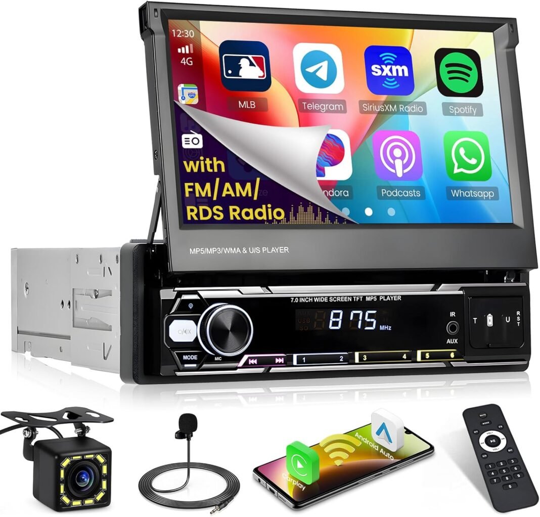 Radio 1 Din Con CON Pantalla Táctil Plegable de 7 Pulgadas: en comparación con la Radio 1 Din Ordinaria, La Radio Con Una Pantalla Plegable Te Permite Disfrutar de Una Extraordinaria Experimencia Con Una Pantalla Grande de 7 Pulgadas en Lugar de la Radio 1 Din Ordinaria. Puedes Desplegar La Pantalla Cuando la Necesites y Plegarla si no Necesitas verla, Pero la Radio CarPlay Seígirá Funcionandoando