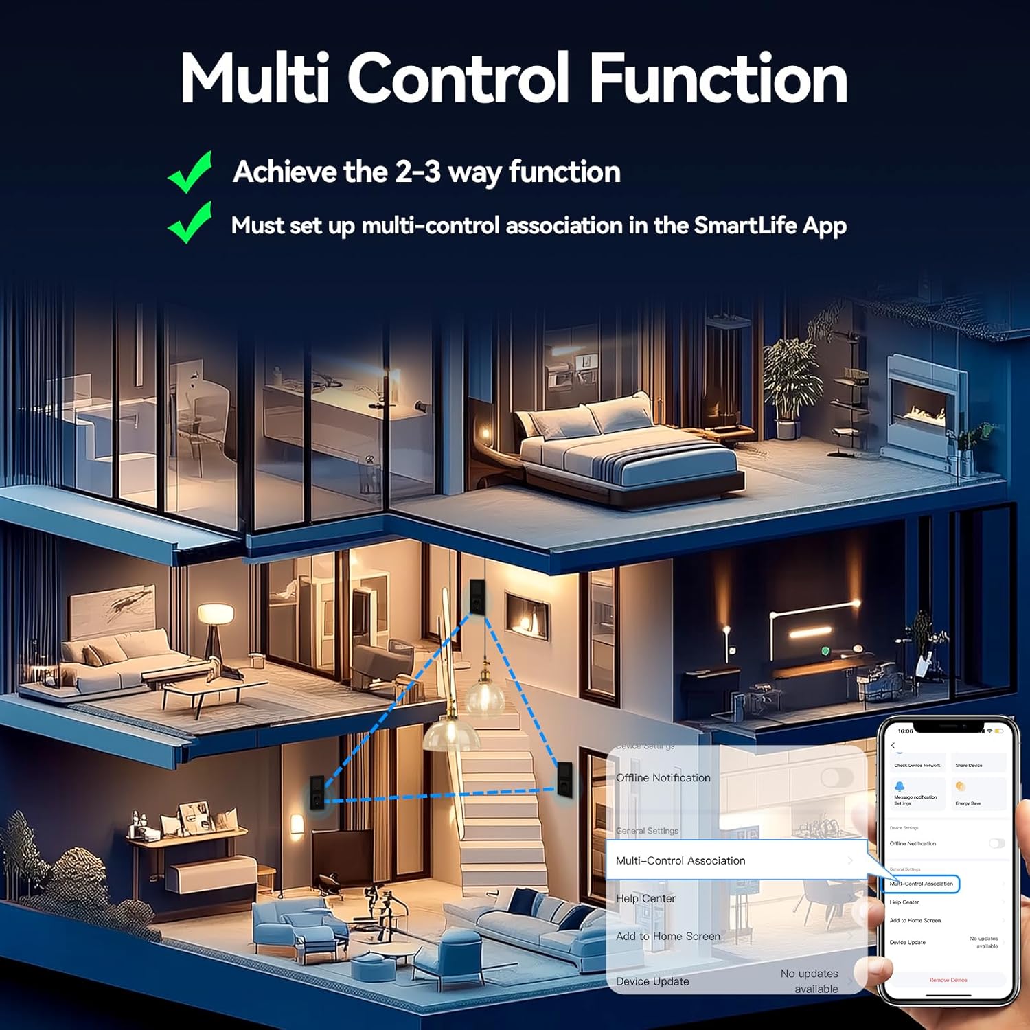 La función de management múltiple le permite controlar las luces desde múltiples ubicaciones. Requiere un cable neutro y al menos dos interruptores, además de activación a través de la aplicación. Nota: El enchufe no tiene wifi, es un enchufe estándar.