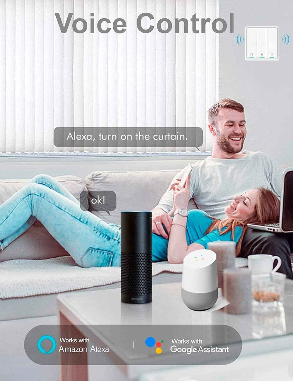 【Management Por Voz Alexa y Google Residence】 Vincula El Interruptor de Cortinas Wifi Con Tus Asistentes de Voz Preferidos Alexa o Google Residence Y Estarán Vinculados para Siempre. PrueBa DiCiito: Alexa Enciende o apaga «Cortinas Salón».