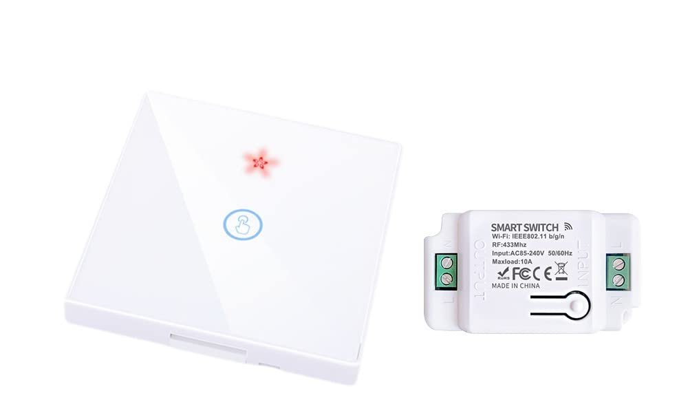 Interruptor táctil de pared, panel de cristal táctil+Relé inalámbrico,10A, funciona con app Tuya/Sensible Life, appropriate con Alexa y Google Assistant(1/un-1GangWS+1/un Controller White)