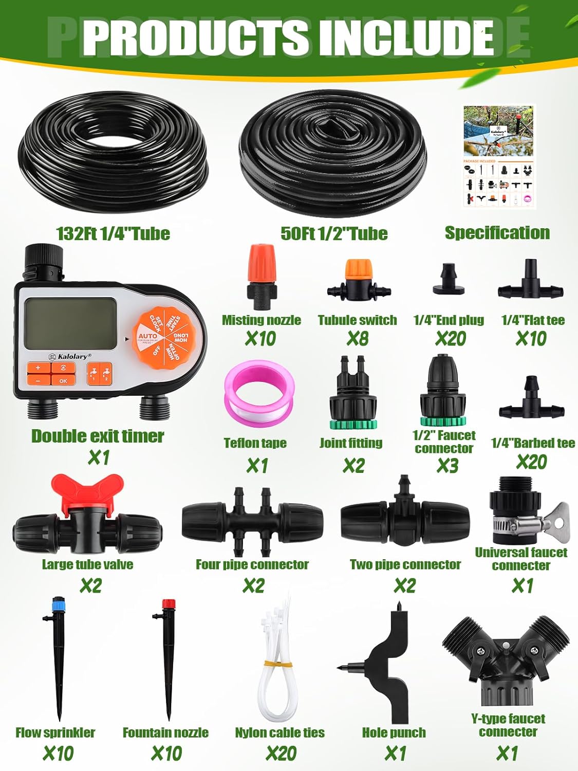 Kalolary Juego de Riego por GOTEO para Jardín de 182 Pies, Sistema de Riego por GOTEO AUMÁTO CON TEMPORIZADOR, TUBO DE 1/2 PULGADA Y 1/4 PULGADAS, SISTEMA DE RIEGO, KITS DE MANGUERA DE GOTEO PARA