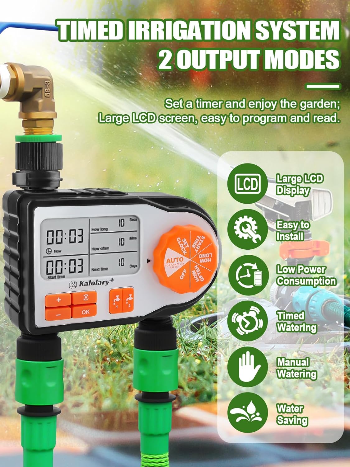 TEMPORIZADOR DE RIEGO INTELIGENTE: EL TEMPORIZADOR DE RIEGO ELECTÓNICO IMPERMABLE Y Resistente A Altas Temperaturas Dispone de una Pantalla Digital Liquid crystal display y OfRece Un Management Preciso. Sistema de Riego eficiente con boquillas ajustables. Equipado Con 2 Salidas de Grifo y Un Diseño de Doble Válvula Con Management de fluJo Ajustable, Permite 2 Caudales y Scale back El Desperdicio de Agua de los Prismático.