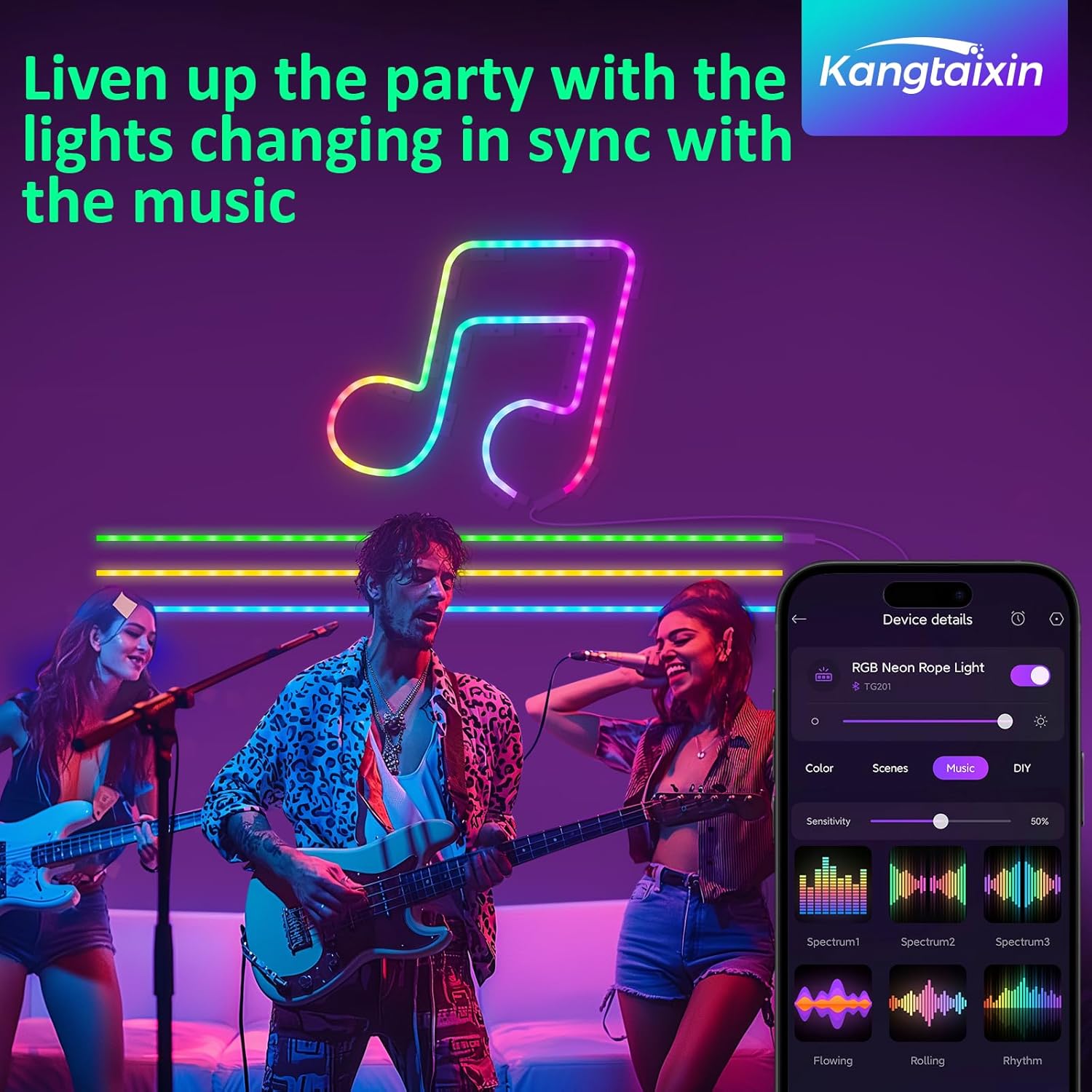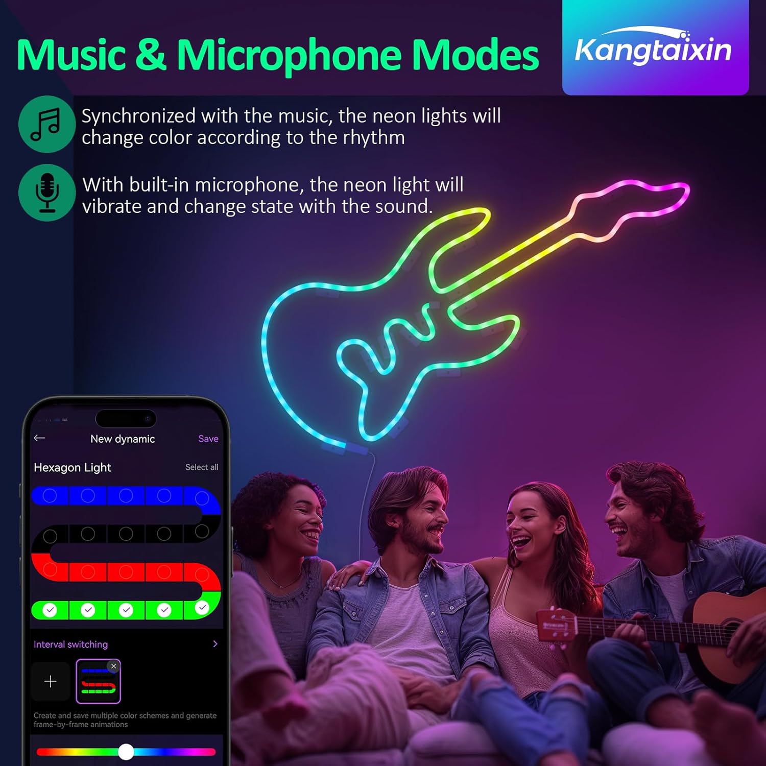 Tira LED de neón Fácil de usar: aporta más diversión a tu mesilla de noche y a la decoración de la pared. 21 modos de escena predefinidos, 6 modos de música. También puede personalizar más modos de escena de neón sin tener que repetir ajustes tediosos.