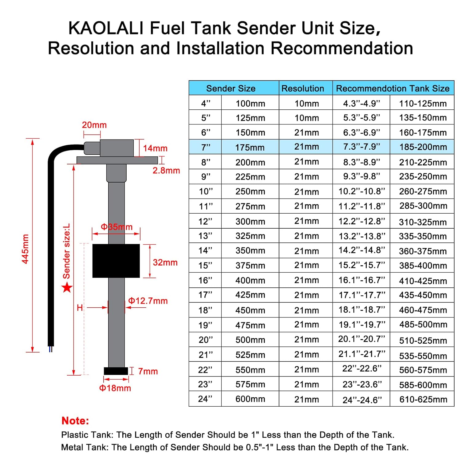 KAOLALI Sensores de nivel de agua, sensor de nivel de flamable para indicador 0-190 ohmios 175MM para barcos de vehículos recreativos