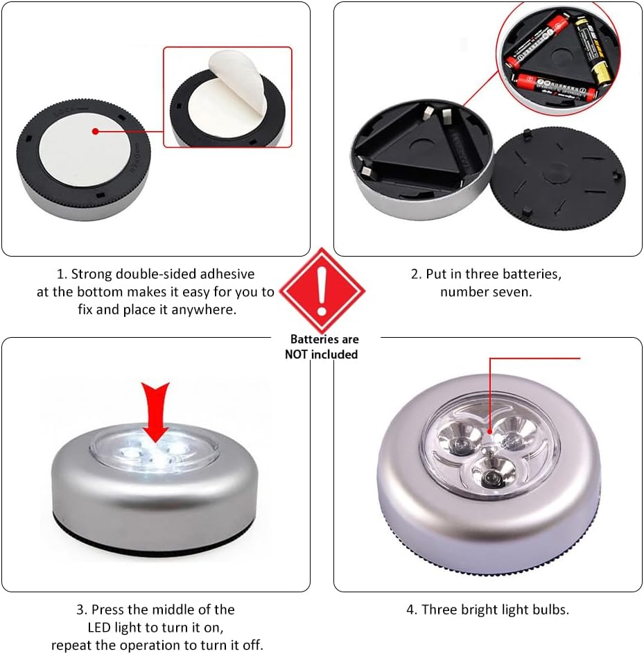 【Management conveniente】 El foco LED autoadhesivo adopta un interruptor táctil, los usuarios solo necesitan presionar el área central de la lámpara para encenderla y repetir el proceso para apagarla, lo que hace que la operación sea rápida. Los usuarios pueden encender o apagar rápidamente las luces cuando sea necesario, lo que hace ideales para iluminación temporal o uso de emergencia.