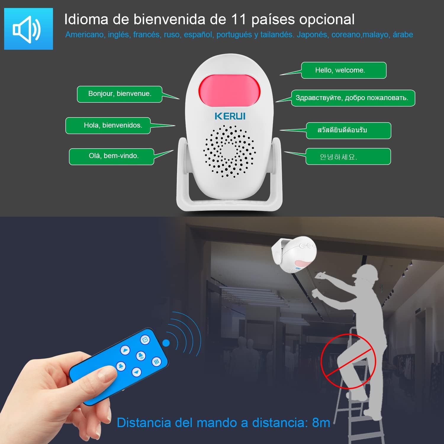 Timbre Alarma Multifuncional: El Timbre Inalámbrico kerui M120 es un sensor de uno Movento de alarma inalámbrico Inteligente independiente que usa un timbre alarma de detección infrarrojo inalámbrico con integra las funciones de timbre, bienida yarma yarma. Tiene alarma Antirrobo, Indicaciones de Voz, Sonidos de Acordes y Sonidos de Simulació de animales. Es adecuado para hogares, hoteles, tidas, oficinas y centros de entretenimiento.