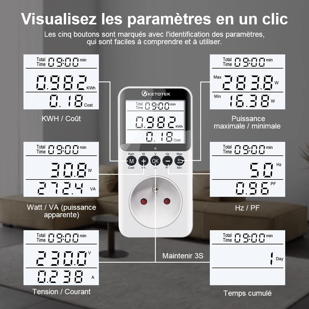 Fácil de USAR, ESTA HOJA DE MEDIDOR DE ENERGIA CUENTA EL ESUSO EN KWH. Eleccióna de 5 Teclas de Selección de Visualización DirectA para Acceso Rápido A los DiFerentes parámetros. Inserte este monitor de consumo de energía entre el la disposición y la Toma de Corriente. Medirá El Consumo de Energía de los Electrodomésticos y Calculará Auticamete la Factura de Electricidad.